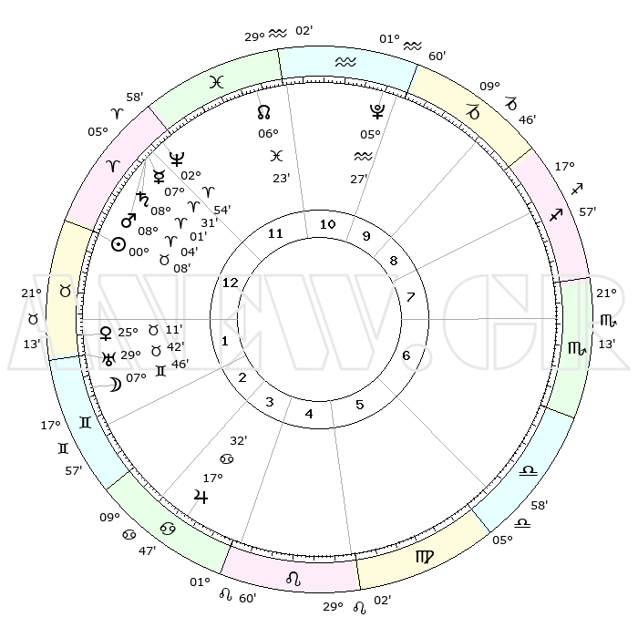 | | ΘΕΣΕΙΣ ΠΛΑΝΗΤΩΝ ΑΣΤΡΟΛΟΓΙΚΟΥ ΧΑΡΤΗ ΤΗΣ ΣΤΙΓΜΗΣ ΑΥΤΗΣ | | | | Πλανήτης | Ζώδιο | Μοίρες | Δεκαήμ. | Σε οίκο | Απόκλιση | | Ακμές των οίκων | | Ηλιος | Ταύρος | 00°04' | Πρώτο | 1 | 11 N 30 | | 1ος | 17°42' | Κριός | | Σελήνη | Δίδυμοι | 06°49' | Πρώτο | 2 | 26 N 28 | | 2ος | 23°20' | Ταύρος | | Ερμής | Κριός | 07°25' | Πρώτο | 12 | 00 N 32 | | 3ος | 18°17' | Δίδυμοι | | Αφροδίτη | Ταύρος | 25°06' | Τρίτο | 2 | 19 N 26 | | 4ος | 10°03' | Καρκίνος | | Αρης | Κριός | 08°01' | Πρώτο | 12 | 02 N 18 | | 5ος | 03°24' | Λέων | | Δίας | Καρκίνος | 17°32' | Δεύτερο | 4 | 22 N 40 | | 6ος | 03°46' | Παρθένος | | Κρόνος | Κριός | 08°00' | Πρώτο | 12 | 01 N 12 | | 7ος | 17°42' | Ζυγός | | Ουρανός | Ταύρος | 29°41' | Τρίτο | 2 | 19 N 55 | | 8ος | 23°20' | Σκορπιός | | Ποσειδώνας | Κριός | 02°54' | Πρώτο | 12 | 00 S 03 | | 9ος | 18°17' | Τοξότης | | Πλούτωνας | Υδροχόος | 05°27' | Πρώτο | 11 | 22 S 48 | | 10ος | 10°03' | Αιγόκερως | | Β. Δεσμός | Ιχθείς | 06°23' | Πρώτο | 12 | 09 S 10 | | 11ος | 03°24' | Υδροχόος | | Ωροσκόπος | Κριός | 17°42' | Δεύτερο | | | 12ος | 03°46' | Ιχθείς | | Μεσουράνημα | Αιγόκερως | 10°03' | Δεύτερο | | | |