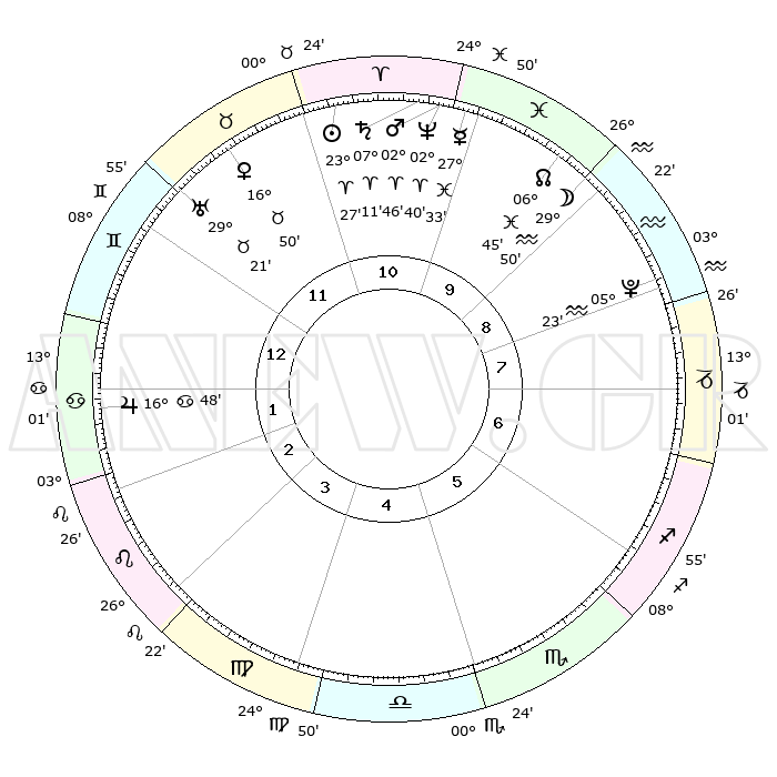 | | ΘΕΣΕΙΣ ΠΛΑΝΗΤΩΝ ΑΣΤΡΟΛΟΓΙΚΟΥ ΧΑΡΤΗ ΤΗΣ ΣΤΙΓΜΗΣ ΑΥΤΗΣ | | | | Πλανήτης | Ζώδιο | Μοίρες | Δεκαήμ. | Σε οίκο | Απόκλιση | | Ακμές των οίκων | | Ηλιος | Κριός | 23°23' | Τρίτο | 11 | 09 N 05 | | 1ος | 20°41' | Δίδυμοι | | Σελήνη | Υδροχόος | 28°57' | Τρίτο | 10 | 12 S 37 | | 2ος | 12°16' | Καρκίνος | | Ερμής | Ιχθείς | 27°28' | Τρίτο | 10 | 03 S 20 | | 3ος | 03°37' | Λέων | | Αφροδίτη | Ταύρος | 16°45' | Δεύτερο | 12 | 16 N 56 | | 4ος | 28°33' | Λέων | | Αρης | Κριός | 02°43' | Πρώτο | 11 | 00 N 10 | | 5ος | 00°51' | Ζυγός | | Δίας | Καρκίνος | 16°48' | Δεύτερο | 2 | 22 N 45 | | 6ος | 11°09' | Σκορπιός | | Κρόνος | Κριός | 07°11' | Πρώτο | 11 | 00 N 53 | | 7ος | 20°41' | Τοξότης | | Ουρανός | Ταύρος | 29°20' | Τρίτο | 12 | 19 N 50 | | 8ος | 12°16' | Αιγόκερως | | Ποσειδώνας | Κριός | 02°40' | Πρώτο | 11 | 00 S 09 | | 9ος | 03°37' | Υδροχόος | | Πλούτωνας | Υδροχόος | 05°23' | Πρώτο | 9 | 22 S 47 | | 10ος | 28°33' | Υδροχόος | | Β. Δεσμός | Ιχθείς | 06°45' | Πρώτο | 10 | 09 S 02 | | 11ος | 00°51' | Κριός | | Ωροσκόπος | Δίδυμοι | 20°41' | Τρίτο | | | 12ος | 11°09' | Ταύρος | | Μεσουράνημα | Υδροχόος | 28°33' | Τρίτο | | | |
