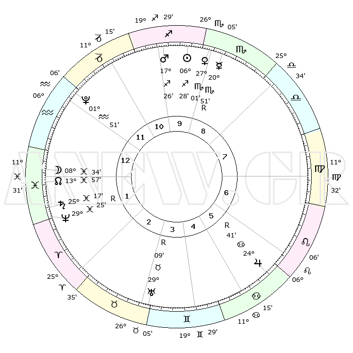 | | ΘΕΣΕΙΣ ΠΛΑΝΗΤΩΝ ΑΣΤΡΟΛΟΓΙΚΟΥ ΧΑΡΤΗ ΤΗΣ ΣΤΙΓΜΗΣ ΑΥΤΗΣ | | | | Πλανήτης | Ζώδιο | Μοίρες | Δεκαήμ. | Σε οίκο | Απόκλιση | | Ακμές των οίκων | | Ηλιος | Τοξότης | 06°27' | Πρώτο | 9 | 21 S 23 | | 1ος | 02°13' | Ιχθείς | | Σελήνη | Ιχθείς | 08°21' | Πρώτο | 1 | 08 S 56 | | 2ος | 17°27' | Κριός | | Ερμής | Σκορπιός | 20°52'R | Τρίτο | 9 | 15 S 37 | | 3ος | 19°44' | Ταύρος | | Αφροδίτη | Σκορπιός | 27°00' | Τρίτο | 9 | 18 S 43 | | 4ος | 13°55' | Δίδυμοι | | Αρης | Τοξότης | 17°25' | Δεύτερο | 10 | 23 S 29 | | 5ος | 05°36' | Καρκίνος | | Δίας | Καρκίνος | 24°41'R | Τρίτο | 5 | 21 N 20 | | 6ος | 29°23' | Καρκίνος | | Κρόνος | Ιχθείς | 25°17' | Τρίτο | 1 | 04 S 03 | | 7ος | 02°13' | Παρθένος | | Ουρανός | Ταύρος | 29°09'R | Τρίτο | 3 | 19 N 46 | | 8ος | 17°27' | Ζυγός | | Ποσειδώνας | Ιχθείς | 29°25'R | Τρίτο | 1 | 01 S 29 | | 9ος | 19°44' | Σκορπιός | | Πλούτωνας | Υδροχόος | 01°51' | Πρώτο | 12 | 23 S 25 | | 10ος | 13°55' | Τοξότης | | Β. Δεσμός | Ιχθείς | 13°57' | Δεύτερο | 1 | 06 S 19 | | 11ος | 05°36' | Αιγόκερως | | Ωροσκόπος | Ιχθείς | 02°13' | Πρώτο | | | 12ος | 29°23' | Αιγόκερως | | Μεσουράνημα | Τοξότης | 13°55' | Δεύτερο | | | |