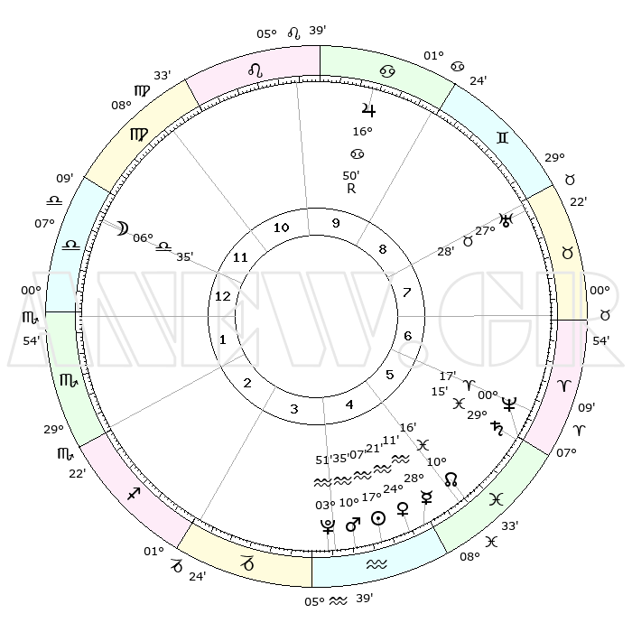 | | ΘΕΣΕΙΣ ΠΛΑΝΗΤΩΝ ΑΣΤΡΟΛΟΓΙΚΟΥ ΧΑΡΤΗ ΤΗΣ ΣΤΙΓΜΗΣ ΑΥΤΗΣ | | | | Πλανήτης | Ζώδιο | Μοίρες | Δεκαήμ. | Σε οίκο | Απόκλιση | | Ακμές των οίκων | | Ηλιος | Υδροχόος | 17°03' | Δεύτερο | 5 | 15 S 43 | | 1ος | 12°13' | Ζυγός | | Σελήνη | Ζυγός | 05°46' | Πρώτο | 12 | 04 S 27 | | 2ος | 09°36' | Σκορπιός | | Ερμής | Υδροχόος | 28°04' | Τρίτο | 5 | 13 S 31 | | 3ος | 10°31' | Τοξότης | | Αφροδίτη | Υδροχόος | 24°16' | Τρίτο | 5 | 14 S 46 | | 4ος | 13°46' | Αιγόκερως | | Αρης | Υδροχόος | 10°32' | Δεύτερο | 4 | 18 S 37 | | 5ος | 16°42' | Υδροχόος | | Δίας | Καρκίνος | 16°50'R | Δεύτερο | 10 | 22 N 41 | | 6ος | 16°36' | Ιχθείς | | Κρόνος | Ιχθείς | 29°15' | Τρίτο | 6 | 02 S 17 | | 7ος | 12°13' | Κριός | | Ουρανός | Ταύρος | 27°28' | Τρίτο | 8 | 19 N 24 | | 8ος | 09°36' | Ταύρος | | Ποσειδώνας | Κριός | 00°17' | Πρώτο | 6 | 01 S 06 | | 9ος | 10°31' | Δίδυμοι | | Πλούτωνας | Υδροχόος | 03°51' | Πρώτο | 4 | 23 S 00 | | 10ος | 13°46' | Καρκίνος | | Β. Δεσμός | Ιχθείς | 10°16' | Δεύτερο | 5 | 07 S 43 | | 11ος | 16°42' | Λέων | | Ωροσκόπος | Ζυγός | 12°13' | Δεύτερο | | | 12ος | 16°36' | Παρθένος | | Μεσουράνημα | Καρκίνος | 13°46' | Δεύτερο | | | |