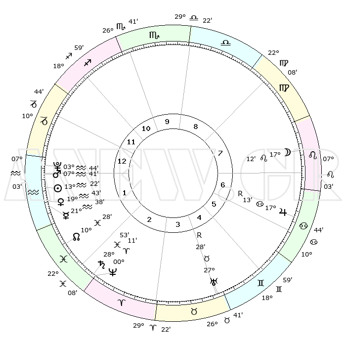 | | ΘΕΣΕΙΣ ΠΛΑΝΗΤΩΝ ΑΣΤΡΟΛΟΓΙΚΟΥ ΧΑΡΤΗ ΤΗΣ ΣΤΙΓΜΗΣ ΑΥΤΗΣ | | | | Πλανήτης | Ζώδιο | Μοίρες | Δεκαήμ. | Σε οίκο | Απόκλιση | | Ακμές των οίκων | | Ηλιος | Υδροχόος | 13°18' | Δεύτερο | 1 | 16 S 49 | | 1ος | 11°03' | Αιγόκερως | | Σελήνη | Λέων | 16°18' | Δεύτερο | 7 | 17 N 53 | | 2ος | 21°02' | Υδροχόος | | Ερμής | Υδροχόος | 21°32' | Τρίτο | 2 | 16 S 02 | | 3ος | 01°18' | Κριός | | Αφροδίτη | Υδροχόος | 19°38' | Δεύτερο | 1 | 16 S 14 | | 4ος | 03°17' | Ταύρος | | Αρης | Υδροχόος | 07°38' | Πρώτο | 1 | 19 S 22 | | 5ος | 27°59' | Ταύρος | | Δίας | Καρκίνος | 17°14'R | Δεύτερο | 7 | 22 N 38 | | 6ος | 19°17' | Δίδυμοι | | Κρόνος | Ιχθείς | 28°52' | Τρίτο | 2 | 02 S 27 | | 7ος | 11°03' | Καρκίνος | | Ουρανός | Ταύρος | 27°28'R | Τρίτο | 4 | 19 N 24 | | 8ος | 21°02' | Λέων | | Ποσειδώνας | Κριός | 00°11' | Πρώτο | 2 | 01 S 08 | | 9ος | 01°18' | Ζυγός | | Πλούτωνας | Υδροχόος | 03°44' | Πρώτο | 1 | 23 S 01 | | 10ος | 03°17' | Σκορπιός | | Β. Δεσμός | Ιχθείς | 10°28' | Δεύτερο | 2 | 07 S 38 | | 11ος | 27°59' | Σκορπιός | | Ωροσκόπος | Αιγόκερως | 11°03' | Δεύτερο | | | 12ος | 19°17' | Τοξότης | | Μεσουράνημα | Σκορπιός | 03°17' | Πρώτο | | | |