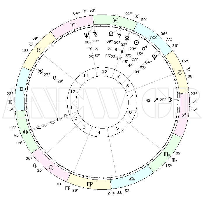 | | ΘΕΣΕΙΣ ΠΛΑΝΗΤΩΝ ΑΣΤΡΟΛΟΓΙΚΟΥ ΧΑΡΤΗ ΤΗΣ ΣΤΙΓΜΗΣ ΑΥΤΗΣ | | | | Πλανήτης | Ζώδιο | Μοίρες | Δεκαήμ. | Σε οίκο | Απόκλιση | | Ακμές των οίκων | | Ηλιος | Υδροχόος | 23°09' | Τρίτο | 4 | 13 S 48 | | 1ος | 23°20' | Ζυγός | | Σελήνη | Τοξότης | 18°34' | Δεύτερο | 2 | 28 S 06 | | 2ος | 21°21' | Σκορπιός | | Ερμής | Ιχθείς | 08°25' | Πρώτο | 5 | 08 S 57 | | 3ος | 22°51' | Τοξότης | | Αφροδίτη | Ιχθείς | 01°49' | Πρώτο | 5 | 12 S 11 | | 4ος | 26°37' | Αιγόκερως | | Αρης | Υδροχόος | 15°16' | Δεύτερο | 4 | 17 S 17 | | 5ος | 29°34' | Υδροχόος | | Δίας | Καρκίνος | 16°17'R | Δεύτερο | 9 | 22 N 46 | | 6ος | 28°47' | Ιχθείς | | Κρόνος | Ιχθείς | 29°53' | Τρίτο | 6 | 02 S 01 | | 7ος | 23°20' | Κριός | | Ουρανός | Ταύρος | 27°29' | Τρίτο | 8 | 19 N 25 | | 8ος | 21°21' | Ταύρος | | Ποσειδώνας | Κριός | 00°28' | Πρώτο | 6 | 01 S 01 | | 9ος | 22°51' | Δίδυμοι | | Πλούτωνας | Υδροχόος | 04°02' | Πρώτο | 4 | 22 S 58 | | 10ος | 26°37' | Καρκίνος | | Β. Δεσμός | Ιχθείς | 09°57' | Πρώτο | 5 | 07 S 50 | | 11ος | 29°34' | Λέων | | Ωροσκόπος | Ζυγός | 23°20' | Τρίτο | | | 12ος | 28°47' | Παρθένος | | Μεσουράνημα | Καρκίνος | 26°37' | Τρίτο | | | |
