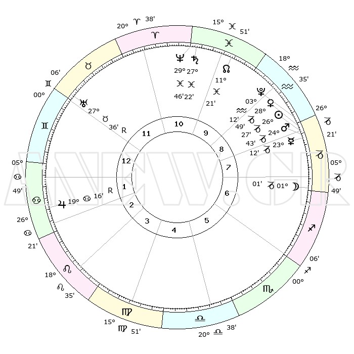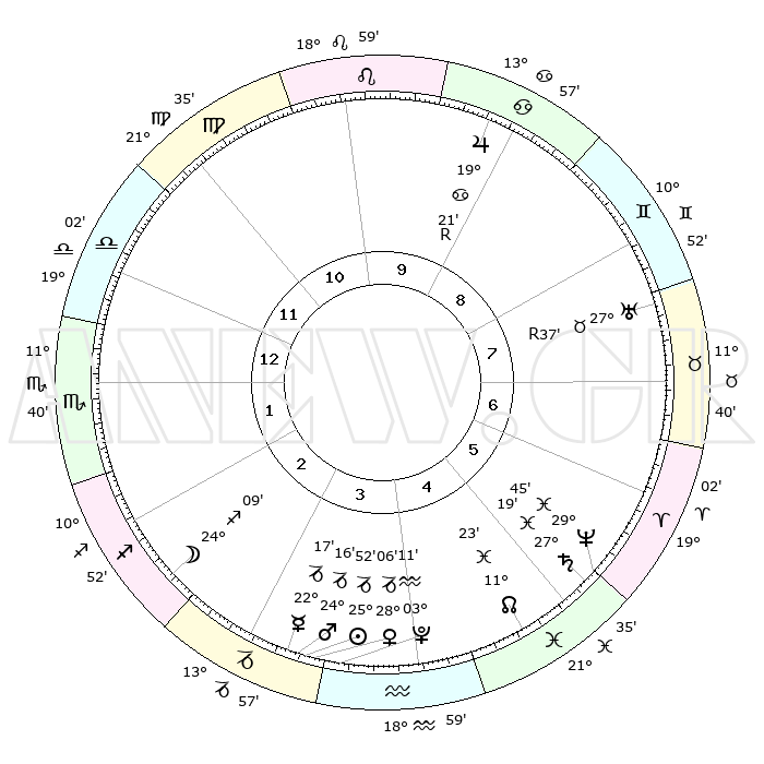 | | ΘΕΣΕΙΣ ΠΛΑΝΗΤΩΝ ΑΣΤΡΟΛΟΓΙΚΟΥ ΧΑΡΤΗ ΤΗΣ ΣΤΙΓΜΗΣ ΑΥΤΗΣ | | | | Πλανήτης | Ζώδιο | Μοίρες | Δεκαήμ. | Σε οίκο | Απόκλιση | | Ακμές των οίκων | | Ηλιος | Αιγόκερως | 26°21' | Τρίτο | 9 | 20 S 53 | | 1ος | 03°27' | Δίδυμοι | | Σελήνη | Τοξότης | 29°56' | Τρίτο | 8 | 28 S 15 | | 2ος | 27°35' | Δίδυμοι | | Ερμής | Αιγόκερως | 23°04' | Τρίτο | 9 | 23 S 18 | | 3ος | 18°54' | Καρκίνος | | Αφροδίτη | Αιγόκερως | 28°42' | Τρίτο | 9 | 21 S 25 | | 4ος | 11°55' | Λέων | | Αρης | Αιγόκερως | 24°39' | Τρίτο | 9 | 22 S 09 | | 5ος | 10°60' | Παρθένος | | Δίας | Καρκίνος | 19°17'R | Δεύτερο | 3 | 22 N 19 | | 6ος | 19°57' | Ζυγός | | Κρόνος | Ιχθείς | 27°22' | Τρίτο | 11 | 03 S 05 | | 7ος | 03°27' | Τοξότης | | Ουρανός | Ταύρος | 27°36'R | Τρίτο | 12 | 19 N 26 | | 8ος | 27°35' | Τοξότης | | Ποσειδώνας | Ιχθείς | 29°46' | Τρίτο | 11 | 01 S 18 | | 9ος | 18°54' | Αιγόκερως | | Πλούτωνας | Υδροχόος | 03°12' | Πρώτο | 9 | 23 S 07 | | 10ος | 11°55' | Υδροχόος | | Β. Δεσμός | Ιχθείς | 11°21' | Δεύτερο | 11 | 07 S 18 | | 11ος | 10°60' | Ιχθείς | | Ωροσκόπος | Δίδυμοι | 03°27' | Πρώτο | | | 12ος | 19°57' | Κριός | | Μεσουράνημα | Υδροχόος | 11°55' | Δεύτερο | | | |