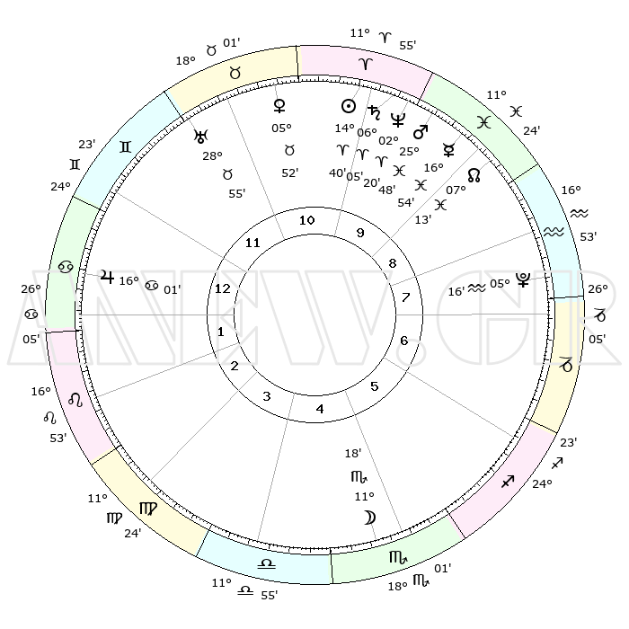 | | ΘΕΣΕΙΣ ΠΛΑΝΗΤΩΝ ΑΣΤΡΟΛΟΓΙΚΟΥ ΧΑΡΤΗ ΤΗΣ ΣΤΙΓΜΗΣ ΑΥΤΗΣ | | | | Πλανήτης | Ζώδιο | Μοίρες | Δεκαήμ. | Σε οίκο | Απόκλιση | | Ακμές των οίκων | | Ηλιος | Κριός | 14°18' | Δεύτερο | 2 | 05 N 38 | | 1ος | 14°28' | Υδροχόος | | Σελήνη | Σκορπιός | 06°53' | Πρώτο | 9 | 17 S 58 | | 2ος | 00°09' | Κριός | | Ερμής | Ιχθείς | 16°32' | Δεύτερο | 1 | 06 S 55 | | 3ος | 05°58' | Ταύρος | | Αφροδίτη | Ταύρος | 05°25' | Πρώτο | 2 | 13 N 02 | | 4ος | 02°11' | Δίδυμοι | | Αρης | Ιχθείς | 25°31' | Τρίτο | 1 | 02 S 44 | | 5ος | 24°10' | Δίδυμοι | | Δίας | Καρκίνος | 15°60' | Δεύτερο | 5 | 22 N 51 | | 6ος | 16°22' | Καρκίνος | | Κρόνος | Κριός | 06°03' | Πρώτο | 2 | 00 N 26 | | 7ος | 14°28' | Λέων | | Ουρανός | Ταύρος | 28°54' | Τρίτο | 3 | 19 N 45 | | 8ος | 00°09' | Ζυγός | | Ποσειδώνας | Κριός | 02°19' | Πρώτο | 2 | 00 S 17 | | 9ος | 05°58' | Σκορπιός | | Πλούτωνας | Υδροχόος | 05°16' | Πρώτο | 12 | 22 S 47 | | 10ος | 02°11' | Τοξότης | | Β. Δεσμός | Ιχθείς | 07°14' | Πρώτο | 1 | 08 S 51 | | 11ος | 24°10' | Τοξότης | | Ωροσκόπος | Υδροχόος | 14°28' | Δεύτερο | | | 12ος | 16°22' | Αιγόκερως | | Μεσουράνημα | Τοξότης | 02°11' | Πρώτο | | | |