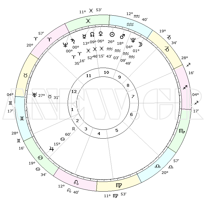 | | ΘΕΣΕΙΣ ΠΛΑΝΗΤΩΝ ΑΣΤΡΟΛΟΓΙΚΟΥ ΧΑΡΤΗ ΤΗΣ ΣΤΙΓΜΗΣ ΑΥΤΗΣ | | | | Πλανήτης | Ζώδιο | Μοίρες | Δεκαήμ. | Σε οίκο | Απόκλιση | | Ακμές των οίκων | | Ηλιος | Υδροχόος | 26°39' | Τρίτο | 11 | 12 S 38 | | 1ος | 04°15' | Ταύρος | | Σελήνη | Υδροχόος | 00°60' | Πρώτο | 10 | 23 S 06 | | 2ος | 05°18' | Δίδυμοι | | Ερμής | Ιχθείς | 13°46' | Δεύτερο | 11 | 06 S 16 | | 3ος | 28°27' | Δίδυμοι | | Αφροδίτη | Ιχθείς | 06°10' | Πρώτο | 11 | 10 S 37 | | 4ος | 20°10' | Καρκίνος | | Αρης | Υδροχόος | 17°60' | Δεύτερο | 11 | 16 S 28 | | 5ος | 15°00' | Λέων | | Δίας | Καρκίνος | 15°60'R | Δεύτερο | 3 | 22 N 48 | | 6ος | 18°34' | Παρθένος | | Κρόνος | Κριός | 00°16' | Πρώτο | 12 | 01 S 52 | | 7ος | 04°15' | Σκορπιός | | Ουρανός | Ταύρος | 27°31' | Τρίτο | 1 | 19 N 25 | | 8ος | 05°18' | Τοξότης | | Ποσειδώνας | Κριός | 00°35' | Πρώτο | 12 | 00 S 58 | | 9ος | 28°27' | Τοξότης | | Πλούτωνας | Υδροχόος | 04°09' | Πρώτο | 10 | 22 S 56 | | 10ος | 20°10' | Αιγόκερως | | Β. Δεσμός | Ιχθείς | 09°46' | Πρώτο | 11 | 07 S 54 | | 11ος | 15°00' | Υδροχόος | | Ωροσκόπος | Ταύρος | 04°15' | Πρώτο | | | 12ος | 18°34' | Ιχθείς | | Μεσουράνημα | Αιγόκερως | 20°10' | Τρίτο | | | |