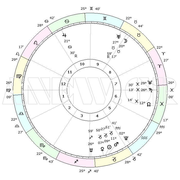 | | ΘΕΣΕΙΣ ΠΛΑΝΗΤΩΝ ΑΣΤΡΟΛΟΓΙΚΟΥ ΧΑΡΤΗ ΤΗΣ ΣΤΙΓΜΗΣ ΑΥΤΗΣ | | | | Πλανήτης | Ζώδιο | Μοίρες | Δεκαήμ. | Σε οίκο | Απόκλιση | | Ακμές των οίκων | | Ηλιος | Αιγόκερως | 09°22' | Πρώτο | 5 | 23 S 06 | | 1ος | 02°30' | Παρθένος | | Σελήνη | Ταύρος | 19°06' | Δεύτερο | 9 | 22 N 00 | | 2ος | 26°37' | Παρθένος | | Ερμής | Τοξότης | 26°51' | Τρίτο | 4 | 23 S 50 | | 3ος | 25°30' | Ζυγός | | Αφροδίτη | Αιγόκερως | 07°44' | Πρώτο | 5 | 23 S 40 | | 4ος | 28°27' | Σκορπιός | | Αρης | Αιγόκερως | 11°47' | Δεύτερο | 5 | 23 S 47 | | 5ος | 02°28' | Αιγόκερως | | Δίας | Καρκίνος | 21°30'R | Τρίτο | 11 | 21 N 57 | | 6ος | 04°14' | Υδροχόος | | Κρόνος | Ιχθείς | 26°13' | Τρίτο | 7 | 03 S 35 | | 7ος | 02°30' | Ιχθείς | | Ουρανός | Ταύρος | 27°59'R | Τρίτο | 9 | 19 N 31 | | 8ος | 26°37' | Ιχθείς | | Ποσειδώνας | Ιχθείς | 29°30' | Τρίτο | 8 | 01 S 26 | | 9ος | 25°30' | Κριός | | Πλούτωνας | Υδροχόος | 02°41' | Πρώτο | 5 | 23 S 14 | | 10ος | 28°27' | Ταύρος | | Β. Δεσμός | Ιχθείς | 12°14' | Δεύτερο | 7 | 06 S 58 | | 11ος | 02°28' | Καρκίνος | | Ωροσκόπος | Παρθένος | 02°30' | Πρώτο | | | 12ος | 04°14' | Λέων | | Μεσουράνημα | Ταύρος | 28°27' | Τρίτο | | | |