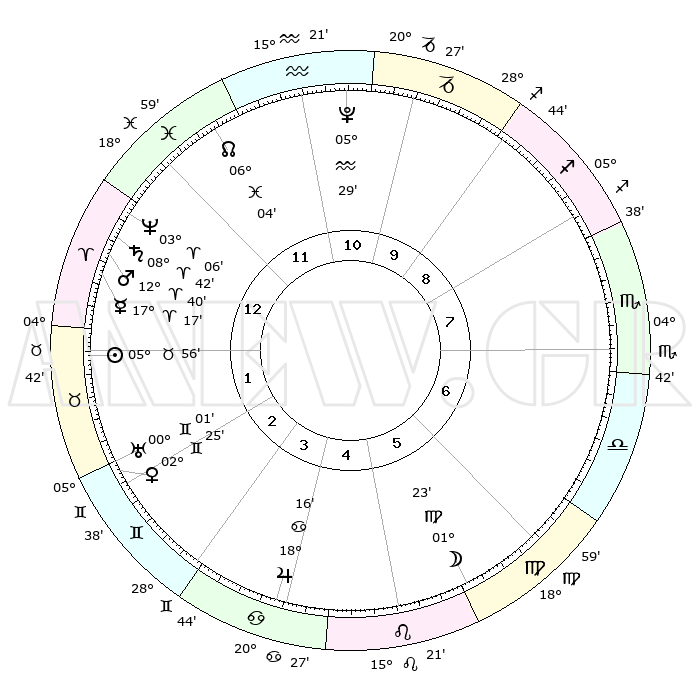 | | ΘΕΣΕΙΣ ΠΛΑΝΗΤΩΝ ΑΣΤΡΟΛΟΓΙΚΟΥ ΧΑΡΤΗ ΤΗΣ ΣΤΙΓΜΗΣ ΑΥΤΗΣ | | | | Πλανήτης | Ζώδιο | Μοίρες | Δεκαήμ. | Σε οίκο | Απόκλιση | | Ακμές των οίκων | | Ηλιος | Ταύρος | 05°49' | Πρώτο | 2 | 13 N 27 | | 1ος | 24°23' | Υδροχόος | | Σελήνη | Λέων | 29°45' | Τρίτο | 7 | 12 N 11 | | 2ος | 10°08' | Κριός | | Ερμής | Κριός | 17°04' | Δεύτερο | 2 | 04 N 31 | | 3ος | 13°58' | Ταύρος | | Αφροδίτη | Δίδυμοι | 02°16' | Πρώτο | 3 | 21 N 16 | | 4ος | 08°57' | Δίδυμοι | | Αρης | Κριός | 12°34' | Δεύτερο | 2 | 04 N 07 | | 5ος | 00°41' | Καρκίνος | | Δίας | Καρκίνος | 18°15' | Δεύτερο | 5 | 22 N 34 | | 6ος | 23°42' | Καρκίνος | | Κρόνος | Κριός | 08°42' | Πρώτο | 1 | 01 N 27 | | 7ος | 24°23' | Λέων | | Ουρανός | Δίδυμοι | 00°00' | Πρώτο | 3 | 19 N 59 | | 8ος | 10°08' | Ζυγός | | Ποσειδώνας | Κριός | 03°06' | Πρώτο | 1 | 00 N 02 | | 9ος | 13°58' | Σκορπιός | | Πλούτωνας | Υδροχόος | 05°29' | Πρώτο | 12 | 22 S 48 | | 10ος | 08°57' | Τοξότης | | Β. Δεσμός | Ιχθείς | 06°05' | Πρώτο | 1 | 09 S 17 | | 11ος | 00°41' | Αιγόκερως | | Ωροσκόπος | Υδροχόος | 24°23' | Τρίτο | | | 12ος | 23°42' | Αιγόκερως | | Μεσουράνημα | Τοξότης | 08°57' | Πρώτο | | | |