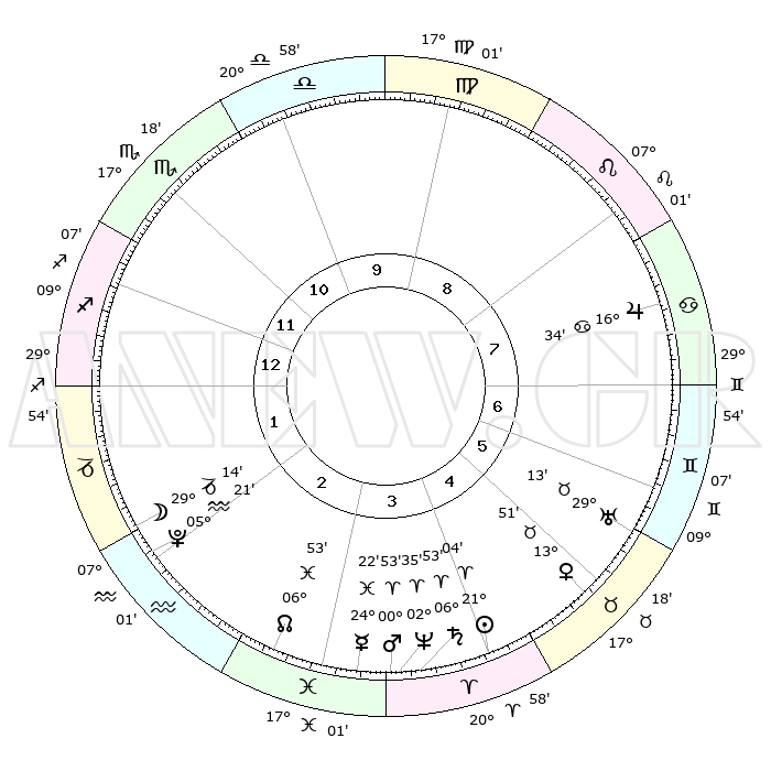 | | ΘΕΣΕΙΣ ΠΛΑΝΗΤΩΝ ΑΣΤΡΟΛΟΓΙΚΟΥ ΧΑΡΤΗ ΤΗΣ ΣΤΙΓΜΗΣ ΑΥΤΗΣ | | | | Πλανήτης | Ζώδιο | Μοίρες | Δεκαήμ. | Σε οίκο | Απόκλιση | | Ακμές των οίκων | | Ηλιος | Κριός | 20°59' | Τρίτο | 5 | 08 N 11 | | 1ος | 04°20' | Τοξότης | | Σελήνη | Αιγόκερως | 28°13' | Τρίτο | 2 | 23 S 46 | | 2ος | 06°06' | Αιγόκερως | | Ερμής | Ιχθείς | 24°16' | Τρίτο | 4 | 04 S 29 | | 3ος | 12°32' | Υδροχόος | | Αφροδίτη | Ταύρος | 13°45' | Δεύτερο | 6 | 15 N 57 | | 4ος | 18°37' | Ιχθείς | | Αρης | Κριός | 00°49' | Πρώτο | 4 | 00 S 36 | | 5ος | 19°05' | Κριός | | Δίας | Καρκίνος | 16°34' | Δεύτερο | 8 | 22 N 47 | | 6ος | 13°33' | Ταύρος | | Κρόνος | Κριός | 06°53' | Πρώτο | 4 | 00 N 46 | | 7ος | 04°20' | Δίδυμοι | | Ουρανός | Ταύρος | 29°13' | Τρίτο | 6 | 19 N 49 | | 8ος | 06°06' | Καρκίνος | | Ποσειδώνας | Κριός | 02°34' | Πρώτο | 4 | 00 S 11 | | 9ος | 12°32' | Λέων | | Πλούτωνας | Υδροχόος | 05°21' | Πρώτο | 2 | 22 S 47 | | 10ος | 18°37' | Παρθένος | | Β. Δεσμός | Ιχθείς | 06°53' | Πρώτο | 3 | 08 S 59 | | 11ος | 19°05' | Ζυγός | | Ωροσκόπος | Τοξότης | 04°20' | Πρώτο | | | 12ος | 13°33' | Σκορπιός | | Μεσουράνημα | Παρθένος | 18°37' | Δεύτερο | | | |