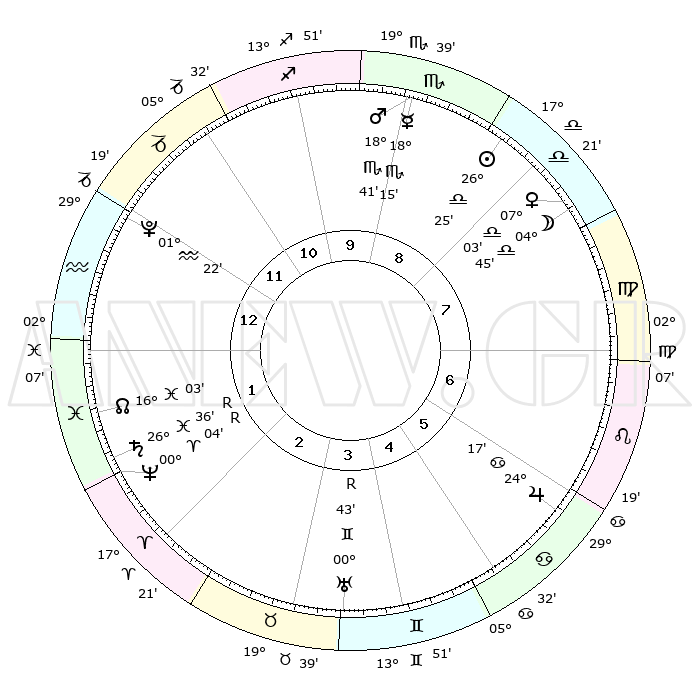 | ΘΕΣΕΙΣ ΠΛΑΝΗΤΩΝ ΑΣΤΡΟΛΟΓΙΚΟΥ ΧΑΡΤΗ ΤΗΣ ΣΤΙΓΜΗΣ ΑΥΤΗΣ | | Πλανήτης | Ζώδιο | Μοίρες | Δεκαήμ. | Σε οίκο | Απόκλιση | | Ακμές των οίκων | Ηλιος | Ζυγός | 26°19' | Τρίτο | 9 | 10 S 09 | | 1ος | 17°48' | Αιγόκερως | Σελήνη | Ζυγός | 03°34' | Πρώτο | 8 | 02 S 42 | | 2ος | 29°26' | Υδροχόος | Ερμής | Σκορπιός | 18°07' | Δεύτερο | 10 | 19 S 19 | | 3ος | 09°21' | Κριός | Αφροδίτη | Ζυγός | 06°56' | Πρώτο | 8 | 01 S 21 | | 4ος | 10°03' | Ταύρος | Αρης | Σκορπιός | 18°37' | Δεύτερο | 10 | 17 S 37 | | 5ος | 03°56' | Δίδυμοι | Δίας | Καρκίνος | 24°17' | Τρίτο | 7 | 21 N 19 | | 6ος | 25°08' | Δίδυμοι | Κρόνος | Ιχθείς | 26°36'R | Τρίτο | 2 | 03 S 38 | | 7ος | 17°48' | Καρκίνος | Ουρανός | Δίδυμοι | 00°43'R | Πρώτο | 4 | 20 N 05 | | 8ος | 29°26' | Λέων | Ποσειδώνας | Κριός | 00°04'R | Πρώτο | 2 | 01 S 14 | | 9ος | 09°21' | Ζυγός | Πλούτωνας | Υδροχόος | 01°22' | Πρώτο | 1 | 23 S 32 | | 10ος | 10°03' | Σκορπιός | Β. Δεσμός | Ιχθείς | 16°04' | Δεύτερο | 2 | 05 S 30 | | 11ος | 03°56' | Τοξότης | Ωροσκόπος | Αιγόκερως | 17°48' | Δεύτερο | | | 12ος | 25°08' | Τοξότης | Μεσουράνημα | Σκορπιός | 10°03' | Δεύτερο | | | |