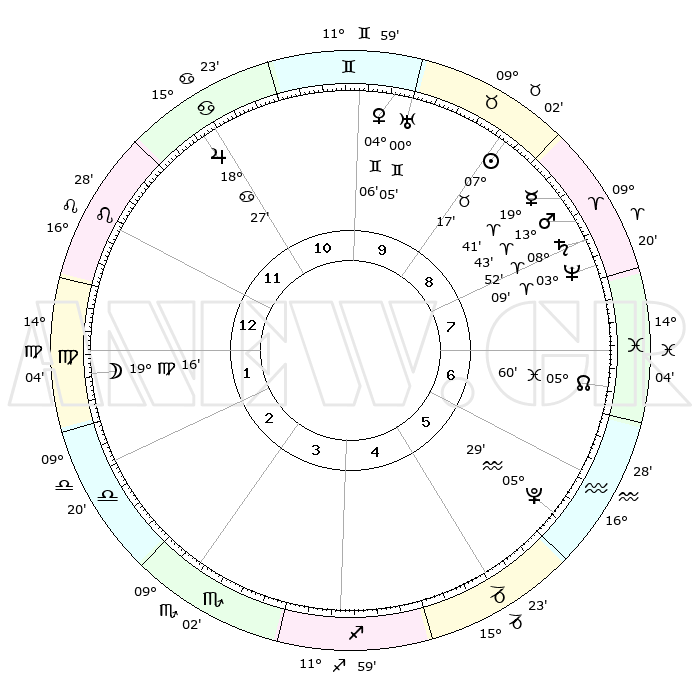 | | ΘΕΣΕΙΣ ΠΛΑΝΗΤΩΝ ΑΣΤΡΟΛΟΓΙΚΟΥ ΧΑΡΤΗ ΤΗΣ ΣΤΙΓΜΗΣ ΑΥΤΗΣ | | | | Πλανήτης | Ζώδιο | Μοίρες | Δεκαήμ. | Σε οίκο | Απόκλιση | | Ακμές των οίκων | | Ηλιος | Ταύρος | 07°13' | Πρώτο | 9 | 13 N 55 | | 1ος | 27°14' | Λέων | | Σελήνη | Παρθένος | 18°31' | Δεύτερο | 1 | 03 N 38 | | 2ος | 20°48' | Παρθένος | | Ερμής | Κριός | 19°35' | Δεύτερο | 9 | 05 N 34 | | 3ος | 19°13' | Ζυγός | | Αφροδίτη | Δίδυμοι | 04°02' | Πρώτο | 10 | 21 N 41 | | 4ος | 22°05' | Σκορπιός | | Αρης | Κριός | 13°41' | Δεύτερο | 8 | 04 N 33 | | 5ος | 26°28' | Τοξότης | | Δίας | Καρκίνος | 18°26' | Δεύτερο | 11 | 22 N 33 | | 6ος | 28°39' | Αιγόκερως | | Κρόνος | Κριός | 08°52' | Πρώτο | 8 | 01 N 31 | | 7ος | 27°14' | Υδροχόος | | Ουρανός | Δίδυμοι | 00°05' | Πρώτο | 10 | 20 N 00 | | 8ος | 20°48' | Ιχθείς | | Ποσειδώνας | Κριός | 03°09' | Πρώτο | 8 | 00 N 03 | | 9ος | 19°13' | Κριός | | Πλούτωνας | Υδροχόος | 05°29' | Πρώτο | 6 | 22 S 48 | | 10ος | 22°05' | Ταύρος | | Β. Δεσμός | Ιχθείς | 06°00' | Πρώτο | 7 | 09 S 18 | | 11ος | 26°28' | Δίδυμοι | | Ωροσκόπος | Λέων | 27°14' | Τρίτο | | | 12ος | 28°39' | Καρκίνος | | Μεσουράνημα | Ταύρος | 22°05' | Τρίτο | | | |