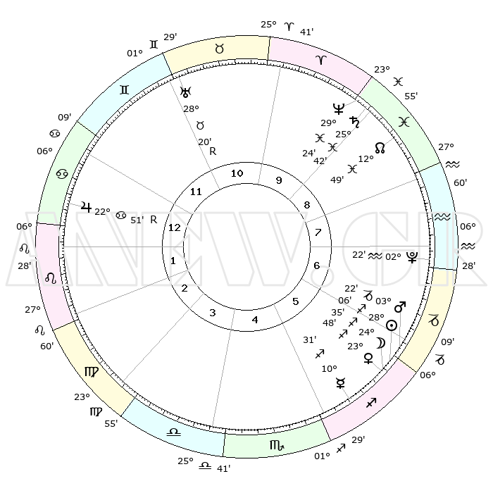| | ΘΕΣΕΙΣ ΠΛΑΝΗΤΩΝ ΑΣΤΡΟΛΟΓΙΚΟΥ ΧΑΡΤΗ ΤΗΣ ΣΤΙΓΜΗΣ ΑΥΤΗΣ | | | | Πλανήτης | Ζώδιο | Μοίρες | Δεκαήμ. | Σε οίκο | Απόκλιση | | Ακμές των οίκων | | Ηλιος | Τοξότης | 27°27' | Τρίτο | 2 | 23 S 24 | | 1ος | 24°31' | Σκορπιός | | Σελήνη | Τοξότης | 17°04' | Δεύτερο | 1 | 27 S 46 | | 2ος | 24°57' | Τοξότης | | Ερμής | Τοξότης | 09°37' | Πρώτο | 1 | 20 S 53 | | 3ος | 29°47' | Αιγόκερως | | Αφροδίτη | Τοξότης | 23°01' | Τρίτο | 1 | 23 S 15 | | 4ος | 05°38' | Ιχθείς | | Αρης | Αιγόκερως | 02°53' | Πρώτο | 2 | 24 S 12 | | 5ος | 07°17' | Κριός | | Δίας | Καρκίνος | 22°55'R | Τρίτο | 8 | 21 N 41 | | 6ος | 03°05' | Ταύρος | | Κρόνος | Ιχθείς | 25°40' | Τρίτο | 4 | 03 S 50 | | 7ος | 24°31' | Ταύρος | | Ουρανός | Ταύρος | 28°21'R | Τρίτο | 7 | 19 N 35 | | 8ος | 24°57' | Δίδυμοι | | Ποσειδώνας | Ιχθείς | 29°24' | Τρίτο | 4 | 01 S 28 | | 9ος | 29°47' | Καρκίνος | | Πλούτωνας | Υδροχόος | 02°21' | Πρώτο | 3 | 23 S 18 | | 10ος | 05°38' | Παρθένος | | Β. Δεσμός | Ιχθείς | 12°51' | Δεύτερο | 4 | 06 S 44 | | 11ος | 07°17' | Ζυγός | | Ωροσκόπος | Σκορπιός | 24°31' | Τρίτο | | | 12ος | 03°05' | Σκορπιός | | Μεσουράνημα | Παρθένος | 05°38' | Πρώτο | | | |
