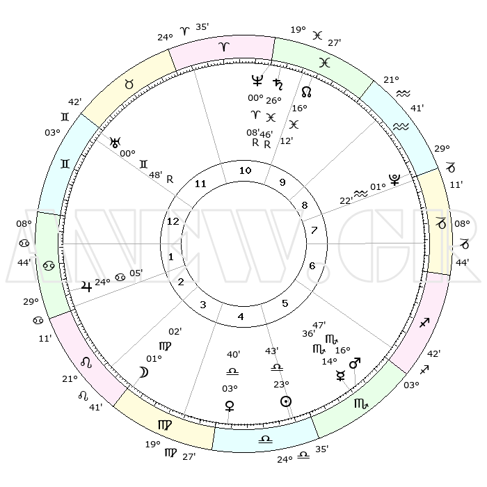 | ΘΕΣΕΙΣ ΠΛΑΝΗΤΩΝ ΑΣΤΡΟΛΟΓΙΚΟΥ ΧΑΡΤΗ ΤΗΣ ΣΤΙΓΜΗΣ ΑΥΤΗΣ | | Πλανήτης | Ζώδιο | Μοίρες | Δεκαήμ. | Σε οίκο | Απόκλιση | | Ακμές των οίκων | Ηλιος | Ζυγός | 22°33' | Τρίτο | 6 | 08 S 46 | | 1ος | 27°19' | Κριός | Σελήνη | Λέων | 16°01' | Δεύτερο | 5 | 18 N 40 | | 2ος | 00°17' | Δίδυμοι | Ερμής | Σκορπιός | 12°59' | Δεύτερο | 7 | 17 S 27 | | 3ος | 24°07' | Δίδυμοι | Αφροδίτη | Ζυγός | 02°13' | Πρώτο | 6 | 00 N 31 | | 4ος | 15°48' | Καρκίνος | Αρης | Σκορπιός | 15°58' | Δεύτερο | 7 | 16 S 50 | | 5ος | 09°57' | Λέων | Δίας | Καρκίνος | 23°59' | Τρίτο | 4 | 21 N 21 | | 6ος | 12°08' | Παρθένος | Κρόνος | Ιχθείς | 26°51'R | Τρίτο | 12 | 03 S 33 | | 7ος | 27°19' | Ζυγός | Ουρανός | Δίδυμοι | 00°50'R | Πρώτο | 2 | 20 N 07 | | 8ος | 00°17' | Τοξότης | Ποσειδώνας | Κριός | 00°10'R | Πρώτο | 12 | 01 S 12 | | 9ος | 24°07' | Τοξότης | Πλούτωνας | Υδροχόος | 01°22' | Πρώτο | 10 | 23 S 32 | | 10ος | 15°48' | Αιγόκερως | Β. Δεσμός | Ιχθείς | 16°16' | Δεύτερο | 12 | 05 S 25 | | 11ος | 09°57' | Υδροχόος | Ωροσκόπος | Κριός | 27°19' | Τρίτο | | | 12ος | 12°08' | Ιχθείς | Μεσουράνημα | Αιγόκερως | 15°48' | Δεύτερο | | | |