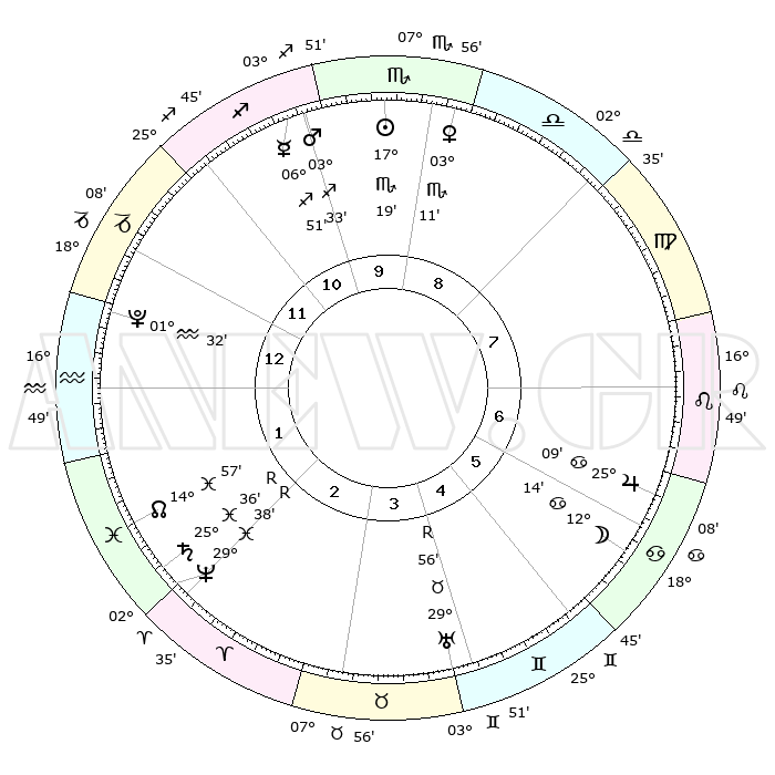 | | ΘΕΣΕΙΣ ΠΛΑΝΗΤΩΝ ΑΣΤΡΟΛΟΓΙΚΟΥ ΧΑΡΤΗ ΤΗΣ ΣΤΙΓΜΗΣ ΑΥΤΗΣ | | | | Πλανήτης | Ζώδιο | Μοίρες | Δεκαήμ. | Σε οίκο | Απόκλιση | | Ακμές των οίκων | | Ηλιος | Σκορπιός | 16°13' | Δεύτερο | 10 | 16 S 41 | | 1ος | 11°46' | Αιγόκερως | | Σελήνη | Δίδυμοι | 26°25' | Τρίτο | 6 | 28 N 23 | | 2ος | 21°56' | Υδροχόος | | Ερμής | Τοξότης | 06°43' | Πρώτο | 11 | 23 S 56 | | 3ος | 02°11' | Κριός | | Αφροδίτη | Σκορπιός | 01°49' | Πρώτο | 9 | 10 S 50 | | 4ος | 04°02' | Ταύρος | | Αρης | Τοξότης | 02°46' | Πρώτο | 11 | 21 S 10 | | 5ος | 28°38' | Ταύρος | | Δίας | Καρκίνος | 25°08' | Τρίτο | 7 | 21 N 12 | | 6ος | 19°55' | Δίδυμοι | | Κρόνος | Ιχθείς | 25°38'R | Τρίτο | 2 | 03 S 59 | | 7ος | 11°46' | Καρκίνος | | Ουρανός | Ταύρος | 29°59'R | Τρίτο | 5 | 19 N 56 | | 8ος | 21°56' | Λέων | | Ποσειδώνας | Ιχθείς | 29°39'R | Τρίτο | 2 | 01 S 23 | | 9ος | 02°11' | Ζυγός | | Πλούτωνας | Υδροχόος | 01°31' | Πρώτο | 1 | 23 S 30 | | 10ος | 04°02' | Σκορπιός | | Β. Δεσμός | Ιχθείς | 15°00' | Δεύτερο | 2 | 05 S 54 | | 11ος | 28°38' | Σκορπιός | | Ωροσκόπος | Αιγόκερως | 11°46' | Δεύτερο | | | 12ος | 19°55' | Τοξότης | | Μεσουράνημα | Σκορπιός | 04°02' | Πρώτο | | | |