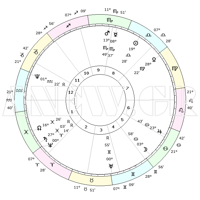 | ΘΕΣΕΙΣ ΠΛΑΝΗΤΩΝ ΑΣΤΡΟΛΟΓΙΚΟΥ ΧΑΡΤΗ ΤΗΣ ΣΤΙΓΜΗΣ ΑΥΤΗΣ | | Πλανήτης | Ζώδιο | Μοίρες | Δεκαήμ. | Σε οίκο | Απόκλιση | | Ακμές των οίκων | Ηλιος | Ζυγός | 19°22' | Δεύτερο | 9 | 07 S 35 | | 1ος | 08°16' | Αιγόκερως | Σελήνη | Καρκίνος | 02°31' | Πρώτο | 6 | 28 N 27 | | 2ος | 17°32' | Υδροχόος | Ερμής | Σκορπιός | 08°28' | Πρώτο | 10 | 15 S 42 | | 3ος | 27°50' | Ιχθείς | Αφροδίτη | Παρθένος | 28°14' | Τρίτο | 9 | 02 N 04 | | 4ος | 00°20' | Ταύρος | Αρης | Σκορπιός | 13°44' | Δεύτερο | 10 | 16 S 09 | | 5ος | 25°25' | Ταύρος | Δίας | Καρκίνος | 23°42' | Τρίτο | 7 | 21 N 24 | | 6ος | 16°48' | Δίδυμοι | Κρόνος | Ιχθείς | 27°03'R | Τρίτο | 2 | 03 S 28 | | 7ος | 08°16' | Καρκίνος | Ουρανός | Δίδυμοι | 00°56'R | Πρώτο | 5 | 20 N 08 | | 8ος | 17°32' | Λέων | Ποσειδώνας | Κριός | 00°14'R | Πρώτο | 3 | 01 S 10 | | 9ος | 27°50' | Παρθένος | Πλούτωνας | Υδροχόος | 01°22'R | Πρώτο | 1 | 23 S 32 | | 10ος | 00°20' | Σκορπιός | Β. Δεσμός | Ιχθείς | 16°26' | Δεύτερο | 2 | 05 S 21 | | 11ος | 25°25' | Σκορπιός | Ωροσκόπος | Αιγόκερως | 08°16' | Πρώτο | | | 12ος | 16°48' | Τοξότης | Μεσουράνημα | Σκορπιός | 00°20' | Πρώτο | | | |
