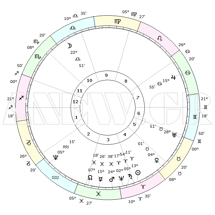 | | ΘΕΣΕΙΣ ΠΛΑΝΗΤΩΝ ΑΣΤΡΟΛΟΓΙΚΟΥ ΧΑΡΤΗ ΤΗΣ ΣΤΙΓΜΗΣ ΑΥΤΗΣ | | | | Πλανήτης | Ζώδιο | Μοίρες | Δεκαήμ. | Σε οίκο | Απόκλιση | | Ακμές των οίκων | | Ηλιος | Κριός | 13°08' | Δεύτερο | 4 | 05 N 11 | | 1ος | 03°01' | Τοξότης | | Σελήνη | Ζυγός | 22°06' | Τρίτο | 11 | 11 S 55 | | 2ος | 04°34' | Αιγόκερως | | Ερμής | Ιχθείς | 15°22' | Δεύτερο | 3 | 07 S 13 | | 3ος | 10°47' | Υδροχόος | | Αφροδίτη | Ταύρος | 03°57' | Πρώτο | 5 | 12 N 29 | | 4ος | 16°52' | Ιχθείς | | Αρης | Ιχθείς | 24°35' | Τρίτο | 4 | 03 S 06 | | 5ος | 17°31' | Κριός | | Δίας | Καρκίνος | 15°54' | Δεύτερο | 8 | 22 N 51 | | 6ος | 12°10' | Ταύρος | | Κρόνος | Κριός | 05°54' | Πρώτο | 4 | 00 N 23 | | 7ος | 03°01' | Δίδυμοι | | Ουρανός | Ταύρος | 28°51' | Τρίτο | 6 | 19 N 44 | | 8ος | 04°34' | Καρκίνος | | Ποσειδώνας | Κριός | 02°17' | Πρώτο | 4 | 00 S 18 | | 9ος | 10°47' | Λέων | | Πλούτωνας | Υδροχόος | 05°15' | Πρώτο | 2 | 22 S 47 | | 10ος | 16°52' | Παρθένος | | Β. Δεσμός | Ιχθείς | 07°18' | Πρώτο | 3 | 08 S 50 | | 11ος | 17°31' | Ζυγός | | Ωροσκόπος | Τοξότης | 03°01' | Πρώτο | | | 12ος | 12°10' | Σκορπιός | | Μεσουράνημα | Παρθένος | 16°52' | Δεύτερο | | | |