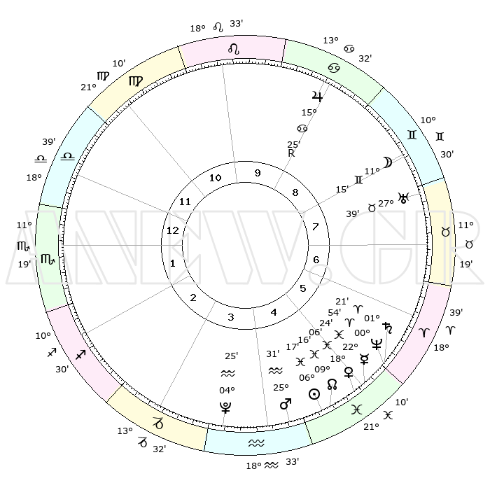 | | ΘΕΣΕΙΣ ΠΛΑΝΗΤΩΝ ΑΣΤΡΟΛΟΓΙΚΟΥ ΧΑΡΤΗ ΤΗΣ ΣΤΙΓΜΗΣ ΑΥΤΗΣ | | | | Πλανήτης | Ζώδιο | Μοίρες | Δεκαήμ. | Σε οίκο | Απόκλιση | | Ακμές των οίκων | | Ηλιος | Ιχθείς | 06°14' | Πρώτο | 5 | 09 S 13 | | 1ος | 26°12' | Ζυγός | | Σελήνη | Δίδυμοι | 10°30' | Δεύτερο | 8 | 27 N 14 | | 2ος | 24°23' | Σκορπιός | | Ερμής | Ιχθείς | 22°24' | Τρίτο | 5 | 00 S 45 | | 3ος | 26°03' | Τοξότης | | Αφροδίτη | Ιχθείς | 18°02' | Δεύτερο | 5 | 06 S 02 | | 4ος | 29°60' | Αιγόκερως | | Αρης | Υδροχόος | 25°29' | Τρίτο | 4 | 14 S 03 | | 5ος | 02°57' | Ιχθείς | | Δίας | Καρκίνος | 15°25'R | Δεύτερο | 9 | 22 N 53 | | 6ος | 01°57' | Κριός | | Κρόνος | Κριός | 01°21' | Πρώτο | 5 | 01 S 25 | | 7ος | 26°12' | Κριός | | Ουρανός | Ταύρος | 27°39' | Τρίτο | 8 | 19 N 27 | | 8ος | 24°23' | Ταύρος | | Ποσειδώνας | Κριός | 00°54' | Πρώτο | 5 | 00 S 50 | | 9ος | 26°03' | Δίδυμοι | | Πλούτωνας | Υδροχόος | 04°25' | Πρώτο | 4 | 22 S 54 | | 10ος | 29°60' | Καρκίνος | | Β. Δεσμός | Ιχθείς | 09°16' | Πρώτο | 5 | 08 S 06 | | 11ος | 02°57' | Παρθένος | | Ωροσκόπος | Ζυγός | 26°12' | Τρίτο | | | 12ος | 01°57' | Ζυγός | | Μεσουράνημα | Καρκίνος | 29°60' | Τρίτο | | | |