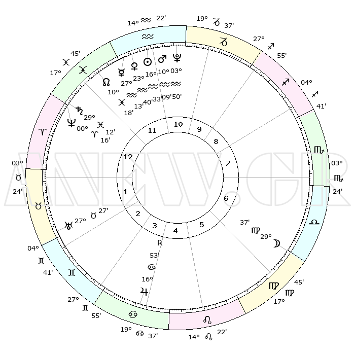 | | ΘΕΣΕΙΣ ΠΛΑΝΗΤΩΝ ΑΣΤΡΟΛΟΓΙΚΟΥ ΧΑΡΤΗ ΤΗΣ ΣΤΙΓΜΗΣ ΑΥΤΗΣ | | | | Πλανήτης | Ζώδιο | Μοίρες | Δεκαήμ. | Σε οίκο | Απόκλιση | | Ακμές των οίκων | | Ηλιος | Υδροχόος | 16°31' | Δεύτερο | 11 | 15 S 53 | | 1ος | 06°01' | Κριός | | Σελήνη | Παρθένος | 28°59' | Τρίτο | 6 | 01 S 14 | | 2ος | 14°48' | Ταύρος | | Ερμής | Υδροχόος | 27°08' | Τρίτο | 12 | 13 S 54 | | 3ος | 11°19' | Δίδυμοι | | Αφροδίτη | Υδροχόος | 23°36' | Τρίτο | 11 | 14 S 59 | | 4ος | 03°23' | Καρκίνος | | Αρης | Υδροχόος | 10°07' | Δεύτερο | 11 | 18 S 43 | | 5ος | 25°59' | Καρκίνος | | Δίας | Καρκίνος | 16°54'R | Δεύτερο | 4 | 22 N 41 | | 6ος | 24°20' | Λέων | | Κρόνος | Ιχθείς | 29°11' | Τρίτο | 12 | 02 S 19 | | 7ος | 06°01' | Ζυγός | | Ουρανός | Ταύρος | 27°27' | Τρίτο | 2 | 19 N 24 | | 8ος | 14°48' | Σκορπιός | | Ποσειδώνας | Κριός | 00°16' | Πρώτο | 12 | 01 S 06 | | 9ος | 11°19' | Τοξότης | | Πλούτωνας | Υδροχόος | 03°50' | Πρώτο | 11 | 23 S 00 | | 10ος | 03°23' | Αιγόκερως | | Β. Δεσμός | Ιχθείς | 10°18' | Δεύτερο | 12 | 07 S 42 | | 11ος | 25°59' | Αιγόκερως | | Ωροσκόπος | Κριός | 06°01' | Πρώτο | | | 12ος | 24°20' | Υδροχόος | | Μεσουράνημα | Αιγόκερως | 03°23' | Πρώτο | | | |