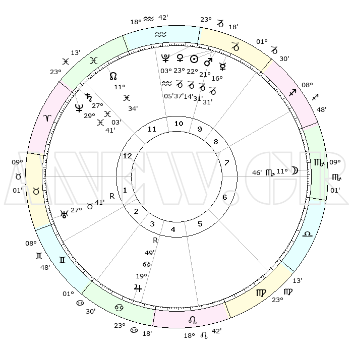 | | ΘΕΣΕΙΣ ΠΛΑΝΗΤΩΝ ΑΣΤΡΟΛΟΓΙΚΟΥ ΧΑΡΤΗ ΤΗΣ ΣΤΙΓΜΗΣ ΑΥΤΗΣ | | | | Πλανήτης | Ζώδιο | Μοίρες | Δεκαήμ. | Σε οίκο | Απόκλιση | | Ακμές των οίκων | | Ηλιος | Αιγόκερως | 22°10' | Τρίτο | 11 | 21 S 37 | | 1ος | 29°19' | Ιχθείς | | Σελήνη | Σκορπιός | 10°56' | Δεύτερο | 8 | 19 S 21 | | 2ος | 09°46' | Ταύρος | | Ερμής | Αιγόκερως | 16°25' | Δεύτερο | 10 | 24 S 02 | | 3ος | 07°17' | Δίδυμοι | | Αφροδίτη | Αιγόκερως | 23°31' | Τρίτο | 11 | 22 S 16 | | 4ος | 29°37' | Δίδυμοι | | Αρης | Αιγόκερως | 21°27' | Τρίτο | 10 | 22 S 40 | | 5ος | 21°53' | Καρκίνος | | Δίας | Καρκίνος | 19°50'R | Δεύτερο | 4 | 22 N 14 | | 6ος | 19°11' | Λέων | | Κρόνος | Ιχθείς | 27°03' | Τρίτο | 12 | 03 S 13 | | 7ος | 29°19' | Παρθένος | | Ουρανός | Ταύρος | 27°41'R | Τρίτο | 2 | 19 N 27 | | 8ος | 09°46' | Σκορπιός | | Ποσειδώνας | Ιχθείς | 29°41' | Τρίτο | 1 | 01 S 20 | | 9ος | 07°17' | Τοξότης | | Πλούτωνας | Υδροχόος | 03°04' | Πρώτο | 11 | 23 S 09 | | 10ος | 29°37' | Τοξότης | | Β. Δεσμός | Ιχθείς | 11°34' | Δεύτερο | 12 | 07 S 13 | | 11ος | 21°53' | Αιγόκερως | | Ωροσκόπος | Ιχθείς | 29°19' | Τρίτο | | | 12ος | 19°11' | Υδροχόος | | Μεσουράνημα | Τοξότης | 29°37' | Τρίτο | | | |