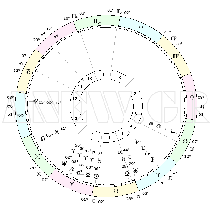 | | ΘΕΣΕΙΣ ΠΛΑΝΗΤΩΝ ΑΣΤΡΟΛΟΓΙΚΟΥ ΧΑΡΤΗ ΤΗΣ ΣΤΙΓΜΗΣ ΑΥΤΗΣ | | | | Πλανήτης | Ζώδιο | Μοίρες | Δεκαήμ. | Σε οίκο | Απόκλιση | | Ακμές των οίκων | | Ηλιος | Ταύρος | 00°51' | Πρώτο | 3 | 11 N 46 | | 1ος | 08°45' | Αιγόκερως | | Σελήνη | Δίδυμοι | 18°38' | Δεύτερο | 6 | 27 N 56 | | 2ος | 18°08' | Υδροχόος | | Ερμής | Κριός | 08°40' | Πρώτο | 3 | 01 N 02 | | 3ος | 28°26' | Ιχθείς | | Αφροδίτη | Ταύρος | 26°04' | Τρίτο | 5 | 19 N 42 | | 4ος | 00°51' | Ταύρος | | Αρης | Κριός | 08°38' | Πρώτο | 3 | 02 N 33 | | 5ος | 25°52' | Ταύρος | | Δίας | Καρκίνος | 17°37' | Δεύτερο | 7 | 22 N 39 | | 6ος | 17°14' | Δίδυμοι | | Κρόνος | Κριός | 08°06' | Πρώτο | 3 | 01 N 14 | | 7ος | 08°45' | Καρκίνος | | Ουρανός | Ταύρος | 29°44' | Τρίτο | 5 | 19 N 56 | | 8ος | 18°08' | Λέων | | Ποσειδώνας | Κριός | 02°56' | Πρώτο | 3 | 00 S 02 | | 9ος | 28°26' | Παρθένος | | Πλούτωνας | Υδροχόος | 05°27' | Πρώτο | 1 | 22 S 48 | | 10ος | 00°51' | Σκορπιός | | Β. Δεσμός | Ιχθείς | 06°21' | Πρώτο | 2 | 09 S 11 | | 11ος | 25°52' | Σκορπιός | | Ωροσκόπος | Αιγόκερως | 08°45' | Πρώτο | | | 12ος | 17°14' | Τοξότης | | Μεσουράνημα | Σκορπιός | 00°51' | Πρώτο | | | |