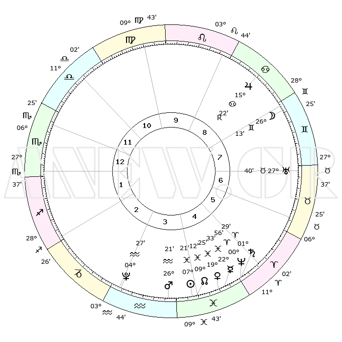 | | ΘΕΣΕΙΣ ΠΛΑΝΗΤΩΝ ΑΣΤΡΟΛΟΓΙΚΟΥ ΧΑΡΤΗ ΤΗΣ ΣΤΙΓΜΗΣ ΑΥΤΗΣ | | | | Πλανήτης | Ζώδιο | Μοίρες | Δεκαήμ. | Σε οίκο | Απόκλιση | | Ακμές των οίκων | | Ηλιος | Ιχθείς | 07°17' | Πρώτο | 4 | 08 S 50 | | 1ος | 10°42' | Σκορπιός | | Σελήνη | Δίδυμοι | 25°23' | Τρίτο | 8 | 28 N 25 | | 2ος | 09°50' | Τοξότης | | Ερμής | Ιχθείς | 22°33' | Τρίτο | 5 | 00 S 28 | | 3ος | 12°48' | Αιγόκερως | | Αφροδίτη | Ιχθείς | 19°21' | Δεύτερο | 4 | 05 S 30 | | 4ος | 17°46' | Υδροχόος | | Αρης | Υδροχόος | 26°18' | Τρίτο | 4 | 13 S 46 | | 5ος | 20°25' | Ιχθείς | | Δίας | Καρκίνος | 15°22'R | Δεύτερο | 9 | 22 N 53 | | 6ος | 17°58' | Κριός | | Κρόνος | Κριός | 01°28' | Πρώτο | 5 | 01 S 22 | | 7ος | 10°42' | Ταύρος | | Ουρανός | Ταύρος | 27°40' | Τρίτο | 7 | 19 N 28 | | 8ος | 09°50' | Δίδυμοι | | Ποσειδώνας | Κριός | 00°56' | Πρώτο | 5 | 00 S 50 | | 9ος | 12°48' | Καρκίνος | | Πλούτωνας | Υδροχόος | 04°27' | Πρώτο | 3 | 22 S 53 | | 10ος | 17°46' | Λέων | | Β. Δεσμός | Ιχθείς | 09°13' | Πρώτο | 4 | 08 S 07 | | 11ος | 20°25' | Παρθένος | | Ωροσκόπος | Σκορπιός | 10°42' | Δεύτερο | | | 12ος | 17°58' | Ζυγός | | Μεσουράνημα | Λέων | 17°46' | Δεύτερο | | | |