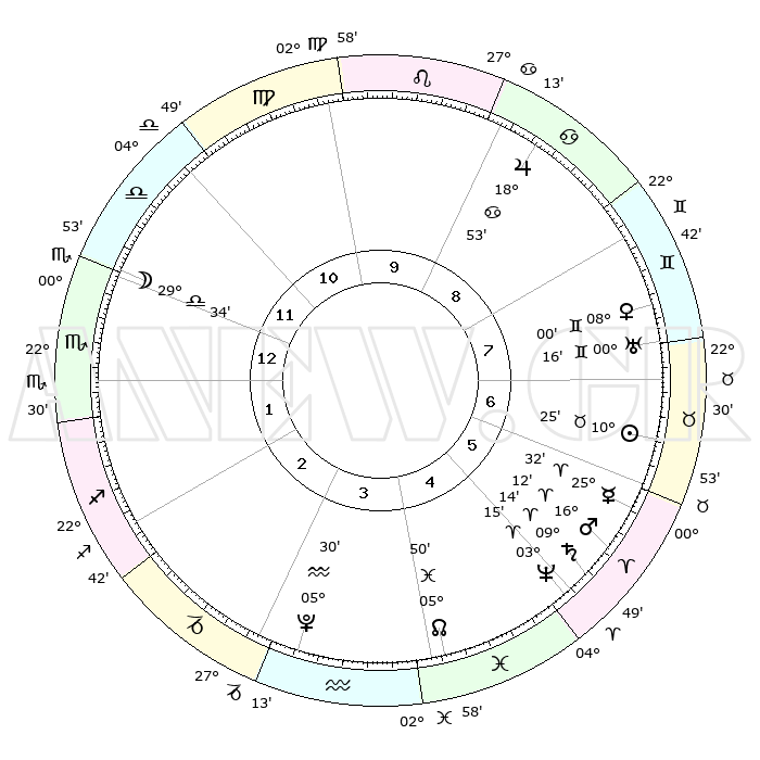 | | ΘΕΣΕΙΣ ΠΛΑΝΗΤΩΝ ΑΣΤΡΟΛΟΓΙΚΟΥ ΧΑΡΤΗ ΤΗΣ ΣΤΙΓΜΗΣ ΑΥΤΗΣ | | | | Πλανήτης | Ζώδιο | Μοίρες | Δεκαήμ. | Σε οίκο | Απόκλιση | | Ακμές των οίκων | | Ηλιος | Ταύρος | 10°22' | Δεύτερο | 7 | 14 N 56 | | 1ος | 07°13' | Σκορπιός | | Σελήνη | Ζυγός | 28°56' | Τρίτο | 12 | 14 S 48 | | 2ος | 06°05' | Τοξότης | | Ερμής | Κριός | 25°26' | Τρίτο | 6 | 08 N 01 | | 3ος | 08°41' | Αιγόκερως | | Αφροδίτη | Δίδυμοι | 07°56' | Πρώτο | 8 | 22 N 30 | | 4ος | 13°24' | Υδροχόος | | Αρης | Κριός | 16°09' | Δεύτερο | 6 | 05 N 32 | | 5ος | 16°10' | Ιχθείς | | Δίας | Καρκίνος | 18°53' | Δεύτερο | 9 | 22 N 29 | | 6ος | 14°07' | Κριός | | Κρόνος | Κριός | 09°14' | Πρώτο | 5 | 01 N 40 | | 7ος | 07°13' | Ταύρος | | Ουρανός | Δίδυμοι | 00°16' | Πρώτο | 7 | 20 N 02 | | 8ος | 06°05' | Δίδυμοι | | Ποσειδώνας | Κριός | 03°15' | Πρώτο | 5 | 00 N 05 | | 9ος | 08°41' | Καρκίνος | | Πλούτωνας | Υδροχόος | 05°30' | Πρώτο | 3 | 22 S 49 | | 10ος | 13°24' | Λέων | | Β. Δεσμός | Ιχθείς | 05°50' | Πρώτο | 4 | 09 S 22 | | 11ος | 16°10' | Παρθένος | | Ωροσκόπος | Σκορπιός | 07°13' | Πρώτο | | | 12ος | 14°07' | Ζυγός | | Μεσουράνημα | Λέων | 13°24' | Δεύτερο | | | |
