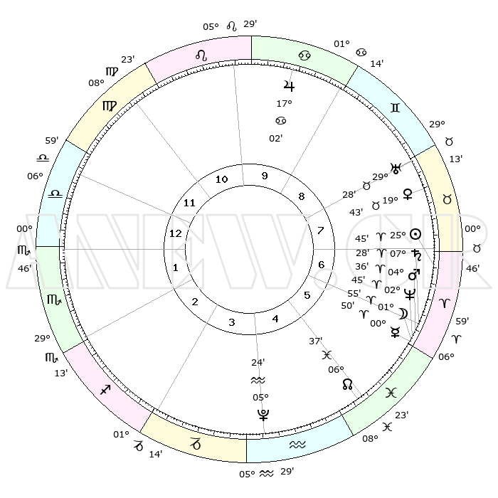 | | ΘΕΣΕΙΣ ΠΛΑΝΗΤΩΝ ΑΣΤΡΟΛΟΓΙΚΟΥ ΧΑΡΤΗ ΤΗΣ ΣΤΙΓΜΗΣ ΑΥΤΗΣ | | | | Πλανήτης | Ζώδιο | Μοίρες | Δεκαήμ. | Σε οίκο | Απόκλιση | | Ακμές των οίκων | | Ηλιος | Κριός | 25°42' | Τρίτο | 7 | 09 N 56 | | 1ος | 12°53' | Ζυγός | | Σελήνη | Κριός | 01°04' | Πρώτο | 6 | 02 N 16 | | 2ος | 10°19' | Σκορπιός | | Ερμής | Κριός | 00°45' | Πρώτο | 6 | 02 S 06 | | 3ος | 11°15' | Τοξότης | | Αφροδίτη | Ταύρος | 19°38' | Δεύτερο | 8 | 17 N 50 | | 4ος | 14°32' | Αιγόκερως | | Αρης | Κριός | 04°33' | Πρώτο | 6 | 00 N 55 | | 5ος | 17°28' | Υδροχόος | | Δίας | Καρκίνος | 17°02' | Δεύτερο | 10 | 22 N 44 | | 6ος | 17°20' | Ιχθείς | | Κρόνος | Κριός | 07°28' | Πρώτο | 6 | 00 N 59 | | 7ος | 12°53' | Κριός | | Ουρανός | Ταύρος | 29°27' | Τρίτο | 8 | 19 N 52 | | 8ος | 10°19' | Ταύρος | | Ποσειδώνας | Κριός | 02°45' | Πρώτο | 6 | 00 S 07 | | 9ος | 11°15' | Δίδυμοι | | Πλούτωνας | Υδροχόος | 05°24' | Πρώτο | 4 | 22 S 47 | | 10ος | 14°32' | Καρκίνος | | Β. Δεσμός | Ιχθείς | 06°38' | Πρώτο | 5 | 09 S 05 | | 11ος | 17°28' | Λέων | | Ωροσκόπος | Ζυγός | 12°53' | Δεύτερο | | | 12ος | 17°20' | Παρθένος | | Μεσουράνημα | Καρκίνος | 14°32' | Δεύτερο | | | |