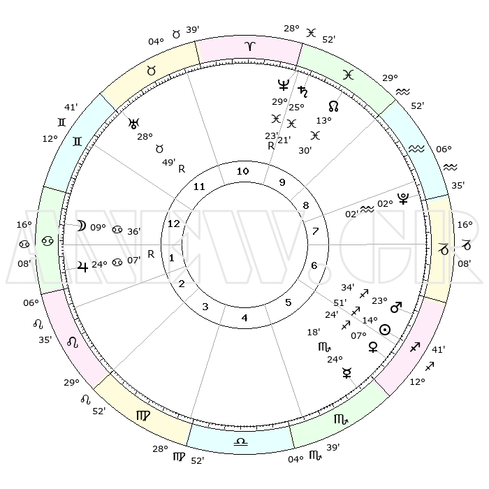 | | ΘΕΣΕΙΣ ΠΛΑΝΗΤΩΝ ΑΣΤΡΟΛΟΓΙΚΟΥ ΧΑΡΤΗ ΤΗΣ ΣΤΙΓΜΗΣ ΑΥΤΗΣ | | | | Πλανήτης | Ζώδιο | Μοίρες | Δεκαήμ. | Σε οίκο | Απόκλιση | | Ακμές των οίκων | | Ηλιος | Τοξότης | 14°46' | Δεύτερο | 6 | 22 S 34 | | 1ος | 19°23' | Δίδυμοι | | Σελήνη | Καρκίνος | 08°23' | Πρώτο | 1 | 27 N 42 | | 2ος | 11°06' | Καρκίνος | | Ερμής | Σκορπιός | 24°14' | Τρίτο | 6 | 16 S 28 | | 3ος | 02°25' | Λέων | | Αφροδίτη | Τοξότης | 07°18' | Πρώτο | 6 | 21 S 02 | | 4ος | 27°10' | Λέων | | Αρης | Τοξότης | 23°30' | Τρίτο | 7 | 23 S 59 | | 5ος | 29°14' | Παρθένος | | Δίας | Καρκίνος | 24°08'R | Τρίτο | 2 | 21 N 27 | | 6ος | 09°31' | Σκορπιός | | Κρόνος | Ιχθείς | 25°21' | Τρίτο | 10 | 04 S 00 | | 7ος | 19°23' | Τοξότης | | Ουρανός | Ταύρος | 28°49'R | Τρίτο | 12 | 19 N 41 | | 8ος | 11°06' | Αιγόκερως | | Ποσειδώνας | Ιχθείς | 29°23'R | Τρίτο | 11 | 01 S 29 | | 9ος | 02°25' | Υδροχόος | | Πλούτωνας | Υδροχόος | 02°02' | Πρώτο | 8 | 23 S 22 | | 10ος | 27°10' | Υδροχόος | | Β. Δεσμός | Ιχθείς | 13°31' | Δεύτερο | 10 | 06 S 29 | | 11ος | 29°14' | Ιχθείς | | Ωροσκόπος | Δίδυμοι | 19°23' | Δεύτερο | | | 12ος | 09°31' | Ταύρος | | Μεσουράνημα | Υδροχόος | 27°10' | Τρίτο | | | |