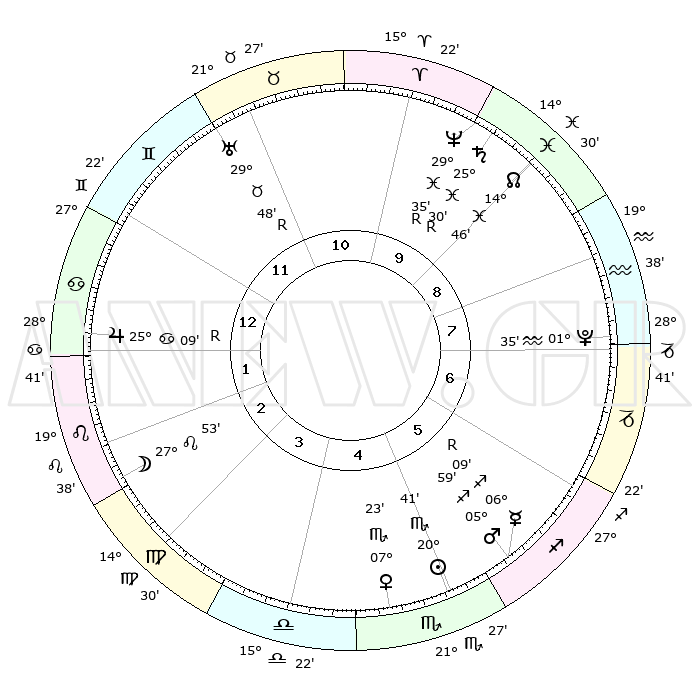 | | ΘΕΣΕΙΣ ΠΛΑΝΗΤΩΝ ΑΣΤΡΟΛΟΓΙΚΟΥ ΧΑΡΤΗ ΤΗΣ ΣΤΙΓΜΗΣ ΑΥΤΗΣ | | | | Πλανήτης | Ζώδιο | Μοίρες | Δεκαήμ. | Σε οίκο | Απόκλιση | | Ακμές των οίκων | | Ηλιος | Σκορπιός | 20°37' | Τρίτο | 5 | 17 S 54 | | 1ος | 06°35' | Καρκίνος | | Σελήνη | Λέων | 26°57' | Τρίτο | 3 | 14 N 06 | | 2ος | 27°05' | Καρκίνος | | Ερμής | Τοξότης | 06°11'R | Πρώτο | 6 | 23 S 06 | | 3ος | 19°23' | Λέων | | Αφροδίτη | Σκορπιός | 07°18' | Πρώτο | 5 | 12 S 45 | | 4ος | 16°47' | Παρθένος | | Αρης | Τοξότης | 05°56' | Πρώτο | 6 | 21 S 47 | | 5ος | 21°40' | Ζυγός | | Δίας | Καρκίνος | 25°09'R | Τρίτο | 1 | 21 N 13 | | 6ος | 01°02' | Τοξότης | | Κρόνος | Ιχθείς | 25°30'R | Τρίτο | 10 | 04 S 01 | | 7ος | 06°35' | Αιγόκερως | | Ουρανός | Ταύρος | 29°48'R | Τρίτο | 11 | 19 N 54 | | 8ος | 27°05' | Αιγόκερως | | Ποσειδώνας | Ιχθείς | 29°35'R | Τρίτο | 10 | 01 S 25 | | 9ος | 19°23' | Υδροχόος | | Πλούτωνας | Υδροχόος | 01°35' | Πρώτο | 8 | 23 S 29 | | 10ος | 16°47' | Ιχθείς | | Β. Δεσμός | Ιχθείς | 14°47' | Δεύτερο | 9 | 06 S 00 | | 11ος | 21°40' | Κριός | | Ωροσκόπος | Καρκίνος | 06°35' | Πρώτο | | | 12ος | 01°02' | Δίδυμοι | | Μεσουράνημα | Ιχθείς | 16°47' | Δεύτερο | | | |