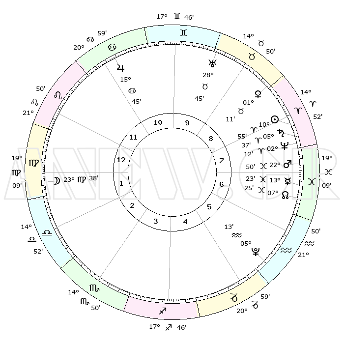 | | ΘΕΣΕΙΣ ΠΛΑΝΗΤΩΝ ΑΣΤΡΟΛΟΓΙΚΟΥ ΧΑΡΤΗ ΤΗΣ ΣΤΙΓΜΗΣ ΑΥΤΗΣ | | | | Πλανήτης | Ζώδιο | Μοίρες | Δεκαήμ. | Σε οίκο | Απόκλιση | | Ακμές των οίκων | | Ηλιος | Κριός | 10°51' | Δεύτερο | 8 | 04 N 18 | | 1ος | 01°15' | Παρθένος | | Σελήνη | Παρθένος | 22°50' | Τρίτο | 1 | 01 N 41 | | 2ος | 25°14' | Παρθένος | | Ερμής | Ιχθείς | 13°20' | Δεύτερο | 7 | 07 S 41 | | 3ος | 24°01' | Ζυγός | | Αφροδίτη | Ταύρος | 01°07' | Πρώτο | 9 | 11 N 26 | | 4ος | 26°56' | Σκορπιός | | Αρης | Ιχθείς | 22°47' | Τρίτο | 7 | 03 S 49 | | 5ος | 01°03' | Αιγόκερως | | Δίας | Καρκίνος | 15°45' | Δεύτερο | 11 | 22 N 52 | | 6ος | 02°54' | Υδροχόος | | Κρόνος | Κριός | 05°36' | Πρώτο | 8 | 00 N 16 | | 7ος | 01°15' | Ιχθείς | | Ουρανός | Ταύρος | 28°45' | Τρίτο | 10 | 19 N 42 | | 8ος | 25°14' | Ιχθείς | | Ποσειδώνας | Κριός | 02°12' | Πρώτο | 8 | 00 S 20 | | 9ος | 24°01' | Κριός | | Πλούτωνας | Υδροχόος | 05°13' | Πρώτο | 6 | 22 S 47 | | 10ος | 26°56' | Ταύρος | | Β. Δεσμός | Ιχθείς | 07°26' | Πρώτο | 7 | 08 S 47 | | 11ος | 01°03' | Καρκίνος | | Ωροσκόπος | Παρθένος | 01°15' | Πρώτο | | | 12ος | 02°54' | Λέων | | Μεσουράνημα | Ταύρος | 26°56' | Τρίτο | | | |