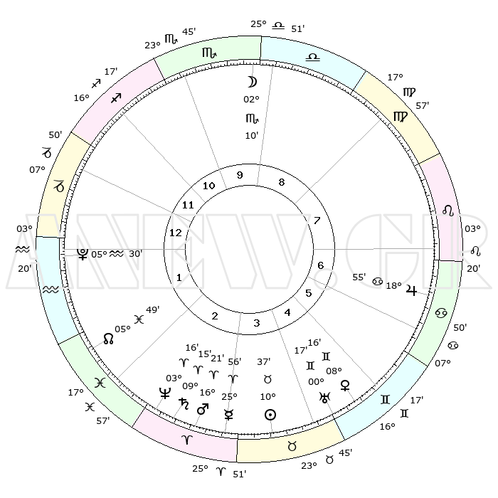 | | ΘΕΣΕΙΣ ΠΛΑΝΗΤΩΝ ΑΣΤΡΟΛΟΓΙΚΟΥ ΧΑΡΤΗ ΤΗΣ ΣΤΙΓΜΗΣ ΑΥΤΗΣ | | | | Πλανήτης | Ζώδιο | Μοίρες | Δεκαήμ. | Σε οίκο | Απόκλιση | | Ακμές των οίκων | | Ηλιος | Ταύρος | 10°32' | Δεύτερο | 4 | 14 N 59 | | 1ος | 26°38' | Τοξότης | | Σελήνη | Σκορπιός | 00°58' | Πρώτο | 10 | 15 S 38 | | 2ος | 02°56' | Υδροχόος | | Ερμής | Κριός | 25°45' | Τρίτο | 4 | 08 N 08 | | 3ος | 12°40' | Ιχθείς | | Αφροδίτη | Δίδυμοι | 08°08' | Πρώτο | 6 | 22 N 32 | | 4ος | 17°07' | Κριός | | Αρης | Κριός | 16°17' | Δεύτερο | 3 | 05 N 35 | | 5ος | 13°58' | Ταύρος | | Δίας | Καρκίνος | 18°54' | Δεύτερο | 7 | 22 N 29 | | 6ος | 06°01' | Δίδυμοι | | Κρόνος | Κριός | 09°15' | Πρώτο | 3 | 01 N 40 | | 7ος | 26°38' | Δίδυμοι | | Ουρανός | Δίδυμοι | 00°16' | Πρώτο | 5 | 20 N 02 | | 8ος | 02°56' | Λέων | | Ποσειδώνας | Κριός | 03°16' | Πρώτο | 3 | 00 N 05 | | 9ος | 12°40' | Παρθένος | | Πλούτωνας | Υδροχόος | 05°30' | Πρώτο | 2 | 22 S 49 | | 10ος | 17°07' | Ζυγός | | Β. Δεσμός | Ιχθείς | 05°49' | Πρώτο | 2 | 09 S 22 | | 11ος | 13°58' | Σκορπιός | | Ωροσκόπος | Τοξότης | 26°38' | Τρίτο | | | 12ος | 06°01' | Τοξότης | | Μεσουράνημα | Ζυγός | 17°07' | Δεύτερο | | | |