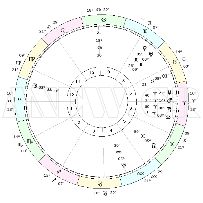 | | ΘΕΣΕΙΣ ΠΛΑΝΗΤΩΝ ΑΣΤΡΟΛΟΓΙΚΟΥ ΧΑΡΤΗ ΤΗΣ ΣΤΙΓΜΗΣ ΑΥΤΗΣ | | | | Πλανήτης | Ζώδιο | Μοίρες | Δεκαήμ. | Σε οίκο | Απόκλιση | | Ακμές των οίκων | | Ηλιος | Ταύρος | 08°18' | Πρώτο | 8 | 14 N 16 | | 1ος | 28°23' | Παρθένος | | Σελήνη | Ζυγός | 02°31' | Πρώτο | 1 | 03 S 00 | | 2ος | 24°51' | Ζυγός | | Ερμής | Κριός | 21°33' | Τρίτο | 7 | 06 N 23 | | 3ος | 25°13' | Σκορπιός | | Αφροδίτη | Δίδυμοι | 05°22' | Πρώτο | 9 | 21 N 58 | | 4ος | 28°11' | Τοξότης | | Αρης | Κριός | 14°32' | Δεύτερο | 7 | 04 N 53 | | 5ος | 01°11' | Υδροχόος | | Δίας | Καρκίνος | 18°35' | Δεύτερο | 10 | 22 N 32 | | 6ος | 01°40' | Ιχθείς | | Κρόνος | Κριός | 08°59' | Πρώτο | 7 | 01 N 34 | | 7ος | 28°23' | Ιχθείς | | Ουρανός | Δίδυμοι | 00°09' | Πρώτο | 9 | 20 N 01 | | 8ος | 24°51' | Κριός | | Ποσειδώνας | Κριός | 03°11' | Πρώτο | 7 | 00 N 03 | | 9ος | 25°13' | Ταύρος | | Πλούτωνας | Υδροχόος | 05°30' | Πρώτο | 5 | 22 S 48 | | 10ος | 28°10' | Δίδυμοι | | Β. Δεσμός | Ιχθείς | 05°57' | Πρώτο | 6 | 09 S 20 | | 11ος | 01°10' | Λέων | | Ωροσκόπος | Παρθένος | 28°23' | Τρίτο | | | 12ος | 01°40' | Παρθένος | | Μεσουράνημα | Δίδυμοι | 28°10' | Τρίτο | | | |