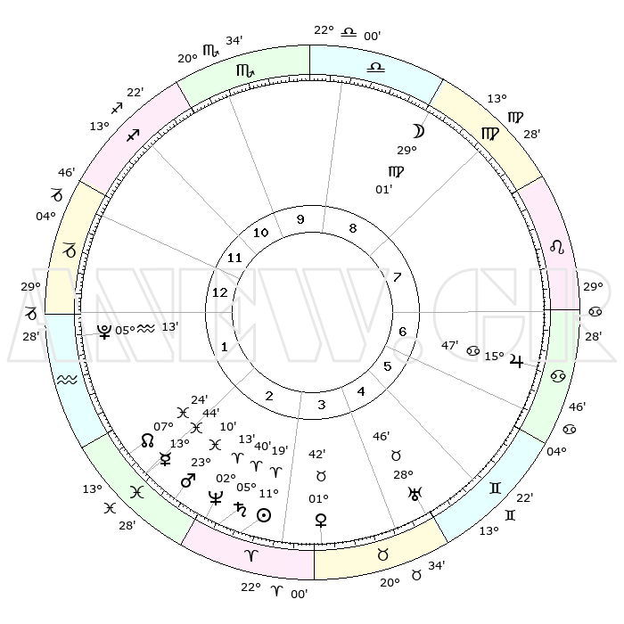 | | ΘΕΣΕΙΣ ΠΛΑΝΗΤΩΝ ΑΣΤΡΟΛΟΓΙΚΟΥ ΧΑΡΤΗ ΤΗΣ ΣΤΙΓΜΗΣ ΑΥΤΗΣ | | | | Πλανήτης | Ζώδιο | Μοίρες | Δεκαήμ. | Σε οίκο | Απόκλιση | | Ακμές των οίκων | | Ηλιος | Κριός | 11°16' | Δεύτερο | 3 | 04 N 27 | | 1ος | 07°08' | Αιγόκερως | | Σελήνη | Παρθένος | 28°16' | Τρίτο | 9 | 00 S 55 | | 2ος | 16°06' | Υδροχόος | | Ερμής | Ιχθείς | 13°41' | Δεύτερο | 2 | 07 S 37 | | 3ος | 26°24' | Ιχθείς | | Αφροδίτη | Ταύρος | 01°38' | Πρώτο | 4 | 11 N 37 | | 4ος | 29°07' | Κριός | | Αρης | Ιχθείς | 23°07' | Τρίτο | 2 | 03 S 42 | | 5ος | 24°21' | Ταύρος | | Δίας | Καρκίνος | 15°47' | Δεύτερο | 7 | 22 N 52 | | 6ος | 15°47' | Δίδυμοι | | Κρόνος | Κριός | 05°40' | Πρώτο | 3 | 00 N 18 | | 7ος | 07°08' | Καρκίνος | | Ουρανός | Ταύρος | 28°46' | Τρίτο | 5 | 19 N 43 | | 8ος | 16°06' | Λέων | | Ποσειδώνας | Κριός | 02°13' | Πρώτο | 3 | 00 S 19 | | 9ος | 26°24' | Παρθένος | | Πλούτωνας | Υδροχόος | 05°13' | Πρώτο | 1 | 22 S 47 | | 10ος | 29°07' | Ζυγός | | Β. Δεσμός | Ιχθείς | 07°24' | Πρώτο | 2 | 08 S 47 | | 11ος | 24°21' | Σκορπιός | | Ωροσκόπος | Αιγόκερως | 07°08' | Πρώτο | | | 12ος | 15°47' | Τοξότης | | Μεσουράνημα | Ζυγός | 29°07' | Τρίτο | | | |