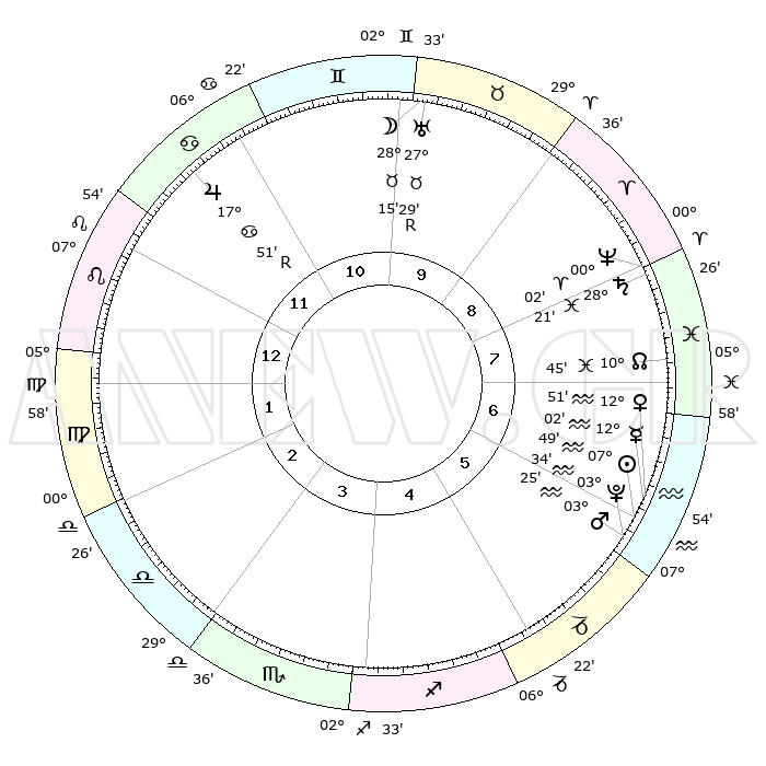 | | ΘΕΣΕΙΣ ΠΛΑΝΗΤΩΝ ΑΣΤΡΟΛΟΓΙΚΟΥ ΧΑΡΤΗ ΤΗΣ ΣΤΙΓΜΗΣ ΑΥΤΗΣ | | | | Πλανήτης | Ζώδιο | Μοίρες | Δεκαήμ. | Σε οίκο | Απόκλιση | | Ακμές των οίκων | | Ηλιος | Υδροχόος | 07°45' | Πρώτο | 6 | 18 S 20 | | 1ος | 19°37' | Λέων | | Σελήνη | Ταύρος | 27°26' | Τρίτο | 10 | 24 N 32 | | 2ος | 12°23' | Παρθένος | | Ερμής | Υδροχόος | 11°56' | Δεύτερο | 6 | 19 S 11 | | 3ος | 09°58' | Ζυγός | | Αφροδίτη | Υδροχόος | 12°47' | Δεύτερο | 6 | 18 S 12 | | 4ος | 12°38' | Σκορπιός | | Αρης | Υδροχόος | 03°22' | Πρώτο | 6 | 20 S 24 | | 5ος | 17°34' | Τοξότης | | Δίας | Καρκίνος | 17°51'R | Δεύτερο | 11 | 22 N 32 | | 6ος | 20°30' | Αιγόκερως | | Κρόνος | Ιχθείς | 28°21' | Τρίτο | 8 | 02 S 40 | | 7ος | 19°37' | Υδροχόος | | Ουρανός | Ταύρος | 27°29'R | Τρίτο | 10 | 19 N 24 | | 8ος | 12°23' | Ιχθείς | | Ποσειδώνας | Κριός | 00°02' | Πρώτο | 8 | 01 S 12 | | 9ος | 09°59' | Κριός | | Πλούτωνας | Υδροχόος | 03°34' | Πρώτο | 6 | 23 S 03 | | 10ος | 12°38' | Ταύρος | | Β. Δεσμός | Ιχθείς | 10°45' | Δεύτερο | 7 | 07 S 32 | | 11ος | 17°34' | Δίδυμοι | | Ωροσκόπος | Λέων | 19°37' | Δεύτερο | | | 12ος | 20°30' | Καρκίνος | | Μεσουράνημα | Ταύρος | 12°38' | Δεύτερο | | | |
