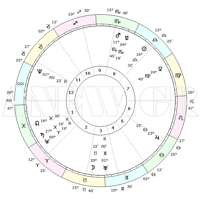 | ΘΕΣΕΙΣ ΠΛΑΝΗΤΩΝ ΑΣΤΡΟΛΟΓΙΚΟΥ ΧΑΡΤΗ ΤΗΣ ΣΤΙΓΜΗΣ ΑΥΤΗΣ | | Πλανήτης | Ζώδιο | Μοίρες | Δεκαήμ. | Σε οίκο | Απόκλιση | | Ακμές των οίκων | Ηλιος | Ζυγός | 16°22' | Δεύτερο | 10 | 06 S 26 | | 1ος | 23°29' | Τοξότης | Σελήνη | Ταύρος | 18°01' | Δεύτερο | 5 | 21 N 31 | | 2ος | 29°03' | Αιγόκερως | Ερμής | Σκορπιός | 04°04' | Πρώτο | 10 | 13 S 55 | | 3ος | 08°26' | Ιχθείς | Αφροδίτη | Παρθένος | 24°28' | Τρίτο | 9 | 03 N 32 | | 4ος | 13°18' | Κριός | Αρης | Σκορπιός | 11°38' | Δεύτερο | 11 | 15 S 29 | | 5ος | 10°41' | Ταύρος | Δίας | Καρκίνος | 23°24' | Τρίτο | 7 | 21 N 26 | | 6ος | 02°59' | Δίδυμοι | Κρόνος | Ιχθείς | 27°16'R | Τρίτο | 3 | 03 S 23 | | 7ος | 23°29' | Δίδυμοι | Ουρανός | Δίδυμοι | 01°01'R | Πρώτο | 5 | 20 N 09 | | 8ος | 29°03' | Καρκίνος | Ποσειδώνας | Κριός | 00°19'R | Πρώτο | 3 | 01 S 08 | | 9ος | 08°26' | Παρθένος | Πλούτωνας | Υδροχόος | 01°22'R | Πρώτο | 2 | 23 S 32 | | 10ος | 13°18' | Ζυγός | Β. Δεσμός | Ιχθείς | 16°36' | Δεύτερο | 3 | 05 S 17 | | 11ος | 10°41' | Σκορπιός | Ωροσκόπος | Τοξότης | 23°29' | Τρίτο | | | 12ος | 02°59' | Τοξότης | Μεσουράνημα | Ζυγός | 13°18' | Δεύτερο | | | |