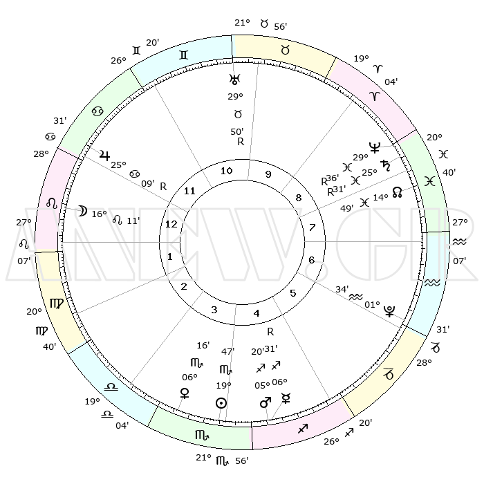 | | ΘΕΣΕΙΣ ΠΛΑΝΗΤΩΝ ΑΣΤΡΟΛΟΓΙΚΟΥ ΧΑΡΤΗ ΤΗΣ ΣΤΙΓΜΗΣ ΑΥΤΗΣ | | | | Πλανήτης | Ζώδιο | Μοίρες | Δεκαήμ. | Σε οίκο | Απόκλιση | | Ακμές των οίκων | | Ηλιος | Σκορπιός | 19°42' | Δεύτερο | 4 | 17 S 39 | | 1ος | 05°11' | Λέων | | Σελήνη | Λέων | 15°10' | Δεύτερο | 1 | 18 N 47 | | 2ος | 26°36' | Λέων | | Ερμής | Τοξότης | 06°32'R | Πρώτο | 5 | 23 S 21 | | 3ος | 22°21' | Παρθένος | | Αφροδίτη | Σκορπιός | 06°10' | Πρώτο | 4 | 12 S 22 | | 4ος | 23°58' | Ζυγός | | Αρης | Τοξότης | 05°16' | Πρώτο | 5 | 21 S 40 | | 5ος | 29°50' | Σκορπιός | | Δίας | Καρκίνος | 25°09'R | Τρίτο | 12 | 21 N 12 | | 6ος | 04°43' | Αιγόκερως | | Κρόνος | Ιχθείς | 25°31'R | Τρίτο | 9 | 04 S 01 | | 7ος | 05°11' | Υδροχόος | | Ουρανός | Ταύρος | 29°51'R | Τρίτο | 11 | 19 N 54 | | 8ος | 26°36' | Υδροχόος | | Ποσειδώνας | Ιχθείς | 29°36'R | Τρίτο | 9 | 01 S 25 | | 9ος | 22°21' | Ιχθείς | | Πλούτωνας | Υδροχόος | 01°34' | Πρώτο | 6 | 23 S 29 | | 10ος | 23°58' | Κριός | | Β. Δεσμός | Ιχθείς | 14°49' | Δεύτερο | 8 | 05 S 59 | | 11ος | 29°50' | Ταύρος | | Ωροσκόπος | Λέων | 05°11' | Πρώτο | | | 12ος | 04°43' | Καρκίνος | | Μεσουράνημα | Κριός | 23°58' | Τρίτο | | | |