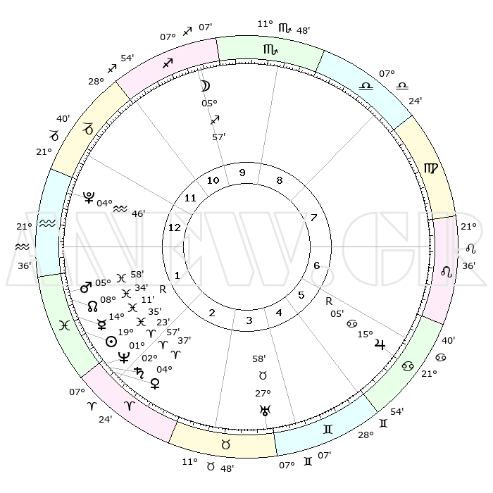 | | ΘΕΣΕΙΣ ΠΛΑΝΗΤΩΝ ΑΣΤΡΟΛΟΓΙΚΟΥ ΧΑΡΤΗ ΤΗΣ ΣΤΙΓΜΗΣ ΑΥΤΗΣ | | | | Πλανήτης | Ζώδιο | Μοίρες | Δεκαήμ. | Σε οίκο | Απόκλιση | | Ακμές των οίκων | | Ηλιος | Ιχθείς | 19°32' | Δεύτερο | 2 | 04 S 09 | | 1ος | 29°54' | Αιγόκερως | | Σελήνη | Τοξότης | 05°24' | Πρώτο | 10 | 26 S 22 | | 2ος | 13°59' | Ιχθείς | | Ερμής | Ιχθείς | 14°13'R | Δεύτερο | 2 | 03 S 06 | | 3ος | 22°27' | Κριός | | Αφροδίτη | Κριός | 04°33' | Πρώτο | 2 | 00 N 44 | | 4ος | 20°56' | Ταύρος | | Αρης | Ιχθείς | 05°56' | Πρώτο | 1 | 10 S 21 | | 5ος | 13°42' | Δίδυμοι | | Δίας | Καρκίνος | 15°05'R | Δεύτερο | 6 | 22 N 56 | | 6ος | 05°07' | Καρκίνος | | Κρόνος | Κριός | 02°56' | Πρώτο | 2 | 00 S 47 | | 7ος | 29°54' | Καρκίνος | | Ουρανός | Ταύρος | 27°58' | Τρίτο | 4 | 19 N 32 | | 8ος | 13°59' | Παρθένος | | Ποσειδώνας | Κριός | 01°23' | Πρώτο | 2 | 00 S 39 | | 9ος | 22°27' | Ζυγός | | Πλούτωνας | Υδροχόος | 04°46' | Πρώτο | 1 | 22 S 50 | | 10ος | 20°56' | Σκορπιός | | Β. Δεσμός | Ιχθείς | 08°34' | Πρώτο | 1 | 08 S 21 | | 11ος | 13°42' | Τοξότης | | Ωροσκόπος | Αιγόκερως | 29°54' | Τρίτο | | | 12ος | 05°07' | Αιγόκερως | | Μεσουράνημα | Σκορπιός | 20°56' | Τρίτο | | | |