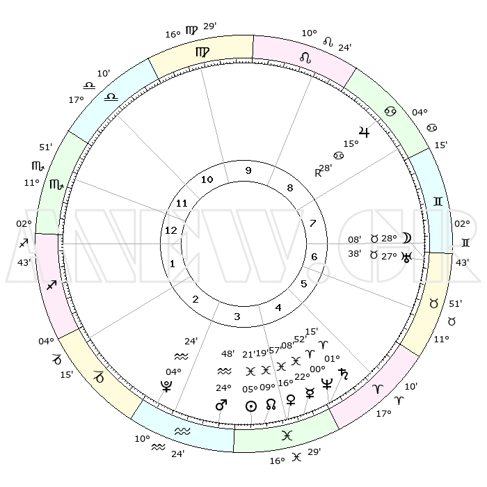 | | ΘΕΣΕΙΣ ΠΛΑΝΗΤΩΝ ΑΣΤΡΟΛΟΓΙΚΟΥ ΧΑΡΤΗ ΤΗΣ ΣΤΙΓΜΗΣ ΑΥΤΗΣ | | | | Πλανήτης | Ζώδιο | Μοίρες | Δεκαήμ. | Σε οίκο | Απόκλιση | | Ακμές των οίκων | | Ηλιος | Ιχθείς | 05°18' | Πρώτο | 4 | 09 S 34 | | 1ος | 16°34' | Σκορπιός | | Σελήνη | Ταύρος | 27°21' | Τρίτο | 7 | 24 N 36 | | 2ος | 16°10' | Τοξότης | | Ερμής | Ιχθείς | 22°06' | Τρίτο | 4 | 01 S 04 | | 3ος | 19°51' | Αιγόκερως | | Αφροδίτη | Ιχθείς | 16°53' | Δεύτερο | 4 | 06 S 29 | | 4ος | 25°14' | Υδροχόος | | Αρης | Υδροχόος | 24°45' | Τρίτο | 3 | 14 S 18 | | 5ος | 27°34' | Ιχθείς | | Δίας | Καρκίνος | 15°28'R | Δεύτερο | 8 | 22 N 52 | | 6ος | 24°24' | Κριός | | Κρόνος | Κριός | 01°14' | Πρώτο | 5 | 01 S 28 | | 7ος | 16°34' | Ταύρος | | Ουρανός | Ταύρος | 27°38' | Τρίτο | 7 | 19 N 27 | | 8ος | 16°10' | Δίδυμοι | | Ποσειδώνας | Κριός | 00°52' | Πρώτο | 5 | 00 S 51 | | 9ος | 19°51' | Καρκίνος | | Πλούτωνας | Υδροχόος | 04°24' | Πρώτο | 3 | 22 S 54 | | 10ος | 25°14' | Λέων | | Β. Δεσμός | Ιχθείς | 09°19' | Πρώτο | 4 | 08 S 04 | | 11ος | 27°34' | Παρθένος | | Ωροσκόπος | Σκορπιός | 16°34' | Δεύτερο | | | 12ος | 24°24' | Ζυγός | | Μεσουράνημα | Λέων | 25°14' | Τρίτο | | | |