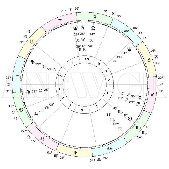 | | ΘΕΣΕΙΣ ΠΛΑΝΗΤΩΝ ΑΣΤΡΟΛΟΓΙΚΟΥ ΧΑΡΤΗ ΤΗΣ ΣΤΙΓΜΗΣ ΑΥΤΗΣ | | | | Πλανήτης | Ζώδιο | Μοίρες | Δεκαήμ. | Σε οίκο | Απόκλιση | | Ακμές των οίκων | | Ηλιος | Σκορπιός | 16°30' | Δεύτερο | 6 | 16 S 46 | | 1ος | 26°15' | Ταύρος | | Σελήνη | Καρκίνος | 00°23' | Πρώτο | 2 | 28 N 21 | | 2ος | 21°51' | Δίδυμοι | | Ερμής | Τοξότης | 06°46' | Πρώτο | 7 | 23 S 54 | | 3ος | 13°25' | Καρκίνος | | Αφροδίτη | Σκορπιός | 02°09' | Πρώτο | 6 | 10 S 57 | | 4ος | 05°55' | Λέων | | Αρης | Τοξότης | 02°58' | Πρώτο | 7 | 21 S 12 | | 5ος | 03°45' | Παρθένος | | Δίας | Καρκίνος | 25°08' | Τρίτο | 3 | 21 N 12 | | 6ος | 11°35' | Ζυγός | | Κρόνος | Ιχθείς | 25°37'R | Τρίτο | 11 | 03 S 59 | | 7ος | 26°15' | Σκορπιός | | Ουρανός | Ταύρος | 29°58'R | Τρίτο | 1 | 19 N 56 | | 8ος | 21°51' | Τοξότης | | Ποσειδώνας | Ιχθείς | 29°39'R | Τρίτο | 11 | 01 S 24 | | 9ος | 13°25' | Αιγόκερως | | Πλούτωνας | Υδροχόος | 01°31' | Πρώτο | 9 | 23 S 30 | | 10ος | 05°55' | Υδροχόος | | Β. Δεσμός | Ιχθείς | 14°60' | Δεύτερο | 11 | 05 S 55 | | 11ος | 03°45' | Ιχθείς | | Ωροσκόπος | Ταύρος | 26°15' | Τρίτο | | | 12ος | 11°35' | Κριός | | Μεσουράνημα | Υδροχόος | 05°55' | Πρώτο | | | |