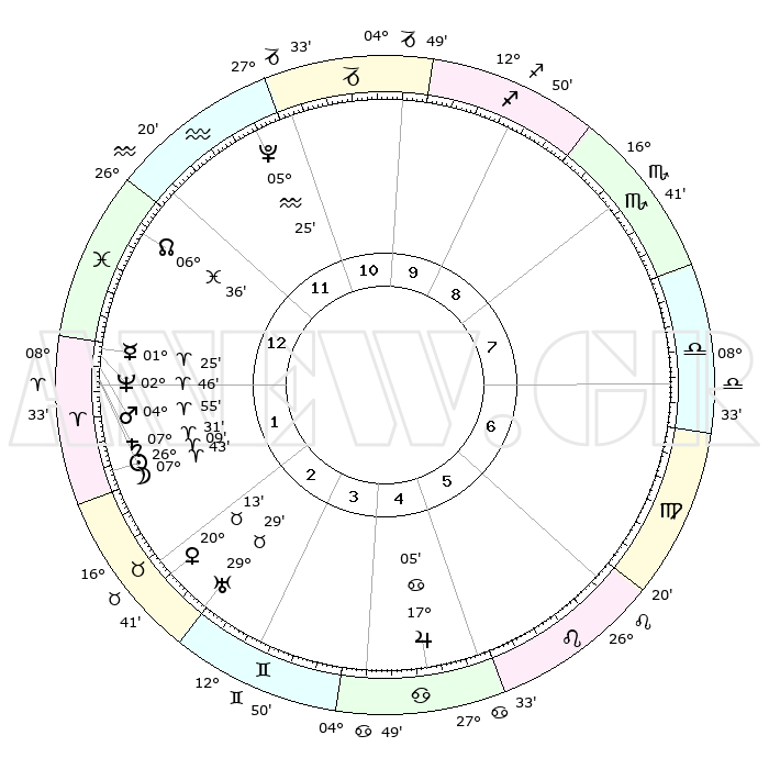 | | ΘΕΣΕΙΣ ΠΛΑΝΗΤΩΝ ΑΣΤΡΟΛΟΓΙΚΟΥ ΧΑΡΤΗ ΤΗΣ ΣΤΙΓΜΗΣ ΑΥΤΗΣ | | | | Πλανήτης | Ζώδιο | Μοίρες | Δεκαήμ. | Σε οίκο | Απόκλιση | | Ακμές των οίκων | | Ηλιος | Κριός | 26°06' | Τρίτο | 2 | 10 N 04 | | 1ος | 00°55' | Ιχθείς | | Σελήνη | Κριός | 06°47' | Πρώτο | 1 | 04 N 58 | | 2ος | 16°15' | Κριός | | Ερμής | Κριός | 01°19' | Πρώτο | 1 | 01 S 52 | | 3ος | 18°47' | Ταύρος | | Αφροδίτη | Ταύρος | 20°08' | Τρίτο | 3 | 17 N 59 | | 4ος | 13°06' | Δίδυμοι | | Αρης | Κριός | 04°52' | Πρώτο | 1 | 01 N 02 | | 5ος | 04°47' | Καρκίνος | | Δίας | Καρκίνος | 17°05' | Δεύτερο | 5 | 22 N 43 | | 6ος | 28°26' | Καρκίνος | | Κρόνος | Κριός | 07°31' | Πρώτο | 1 | 01 N 01 | | 7ος | 00°55' | Παρθένος | | Ουρανός | Ταύρος | 29°29' | Τρίτο | 3 | 19 N 52 | | 8ος | 16°15' | Ζυγός | | Ποσειδώνας | Κριός | 02°46' | Πρώτο | 1 | 00 S 06 | | 9ος | 18°47' | Σκορπιός | | Πλούτωνας | Υδροχόος | 05°25' | Πρώτο | 12 | 22 S 47 | | 10ος | 13°06' | Τοξότης | | Β. Δεσμός | Ιχθείς | 06°36' | Πρώτο | 1 | 09 S 05 | | 11ος | 04°47' | Αιγόκερως | | Ωροσκόπος | Ιχθείς | 00°55' | Πρώτο | | | 12ος | 28°26' | Αιγόκερως | | Μεσουράνημα | Τοξότης | 13°06' | Δεύτερο | | | |