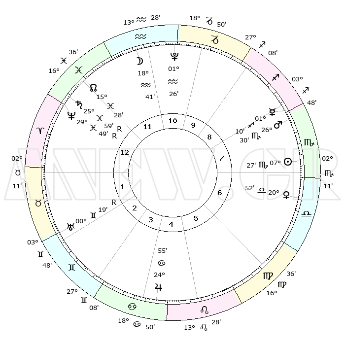 | | ΘΕΣΕΙΣ ΠΛΑΝΗΤΩΝ ΑΣΤΡΟΛΟΓΙΚΟΥ ΧΑΡΤΗ ΤΗΣ ΣΤΙΓΜΗΣ ΑΥΤΗΣ | | | | Πλανήτης | Ζώδιο | Μοίρες | Δεκαήμ. | Σε οίκο | Απόκλιση | | Ακμές των οίκων | | Ηλιος | Σκορπιός | 07°21' | Πρώτο | 8 | 13 S 58 | | 1ος | 01°27' | Ιχθείς | | Σελήνη | Υδροχόος | 17°18' | Δεύτερο | 12 | 18 S 04 | | 2ος | 16°45' | Κριός | | Ερμής | Τοξότης | 01°04' | Πρώτο | 9 | 23 S 11 | | 3ος | 19°11' | Ταύρος | | Αφροδίτη | Ζυγός | 20°44' | Τρίτο | 8 | 06 S 43 | | 4ος | 13°26' | Δίδυμοι | | Αρης | Σκορπιός | 26°26' | Τρίτο | 9 | 19 S 43 | | 5ος | 05°07' | Καρκίνος | | Δίας | Καρκίνος | 24°55' | Τρίτο | 5 | 21 N 13 | | 6ος | 28°50' | Καρκίνος | | Κρόνος | Ιχθείς | 25°60'R | Τρίτο | 1 | 03 S 52 | | 7ος | 01°27' | Παρθένος | | Ουρανός | Δίδυμοι | 00°20'R | Πρώτο | 3 | 20 N 01 | | 8ος | 16°45' | Ζυγός | | Ποσειδώνας | Ιχθείς | 29°49'R | Τρίτο | 1 | 01 S 20 | | 9ος | 19°11' | Σκορπιός | | Πλούτωνας | Υδροχόος | 01°26' | Πρώτο | 12 | 23 S 31 | | 10ος | 13°26' | Τοξότης | | Β. Δεσμός | Ιχθείς | 15°29' | Δεύτερο | 1 | 05 S 43 | | 11ος | 05°07' | Αιγόκερως | | Ωροσκόπος | Ιχθείς | 01°27' | Πρώτο | | | 12ος | 28°50' | Αιγόκερως | | Μεσουράνημα | Τοξότης | 13°26' | Δεύτερο | | | |