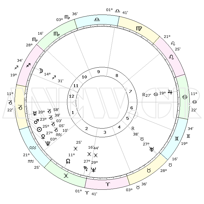 | | ΘΕΣΕΙΣ ΠΛΑΝΗΤΩΝ ΑΣΤΡΟΛΟΓΙΚΟΥ ΧΑΡΤΗ ΤΗΣ ΣΤΙΓΜΗΣ ΑΥΤΗΣ | | | | Πλανήτης | Ζώδιο | Μοίρες | Δεκαήμ. | Σε οίκο | Απόκλιση | | Ακμές των οίκων | | Ηλιος | Αιγόκερως | 24°59' | Τρίτο | 2 | 21 S 08 | | 1ος | 20°03' | Τοξότης | | Σελήνη | Τοξότης | 13°45' | Δεύτερο | 12 | 27 S 31 | | 2ος | 24°49' | Αιγόκερως | | Ερμής | Αιγόκερως | 20°52' | Τρίτο | 1 | 23 S 35 | | 3ος | 03°46' | Ιχθείς | | Αφροδίτη | Αιγόκερως | 27°00' | Τρίτο | 2 | 21 S 43 | | 4ος | 09°03' | Κριός | | Αρης | Αιγόκερως | 23°36' | Τρίτο | 1 | 22 S 20 | | 5ος | 07°00' | Ταύρος | | Δίας | Καρκίνος | 19°28'R | Δεύτερο | 7 | 22 N 17 | | 6ος | 29°37' | Ταύρος | | Κρόνος | Ιχθείς | 27°15' | Τρίτο | 3 | 03 S 08 | | 7ος | 20°03' | Δίδυμοι | | Ουρανός | Ταύρος | 27°38'R | Τρίτο | 5 | 19 N 26 | | 8ος | 24°49' | Καρκίνος | | Ποσειδώνας | Ιχθείς | 29°44' | Τρίτο | 3 | 01 S 19 | | 9ος | 03°46' | Παρθένος | | Πλούτωνας | Υδροχόος | 03°10' | Πρώτο | 2 | 23 S 08 | | 10ος | 09°03' | Ζυγός | | Β. Δεσμός | Ιχθείς | 11°25' | Δεύτερο | 3 | 07 S 17 | | 11ος | 07°00' | Σκορπιός | | Ωροσκόπος | Τοξότης | 20°03' | Τρίτο | | | 12ος | 29°37' | Σκορπιός | | Μεσουράνημα | Ζυγός | 09°03' | Πρώτο | | | |