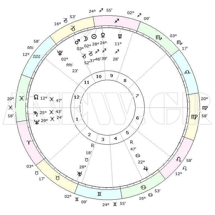 | | ΘΕΣΕΙΣ ΠΛΑΝΗΤΩΝ ΑΣΤΡΟΛΟΓΙΚΟΥ ΧΑΡΤΗ ΤΗΣ ΣΤΙΓΜΗΣ ΑΥΤΗΣ | | | | Πλανήτης | Ζώδιο | Μοίρες | Δεκαήμ. | Σε οίκο | Απόκλιση | | Ακμές των οίκων | | Ηλιος | Τοξότης | 28°42' | Τρίτο | 11 | 23 S 26 | | 1ος | 15°32' | Υδροχόος | | Σελήνη | Αιγόκερως | 01°50' | Πρώτο | 11 | 28 S 08 | | 2ος | 01°15' | Κριός | | Ερμής | Τοξότης | 11°22' | Δεύτερο | 10 | 21 S 18 | | 3ος | 06°52' | Ταύρος | | Αφροδίτη | Τοξότης | 24°34' | Τρίτο | 10 | 23 S 22 | | 4ος | 02°57' | Δίδυμοι | | Αρης | Αιγόκερως | 03°49' | Πρώτο | 11 | 24 S 11 | | 5ος | 24°53' | Δίδυμοι | | Δίας | Καρκίνος | 22°47'R | Τρίτο | 6 | 21 N 43 | | 6ος | 17°10' | Καρκίνος | | Κρόνος | Ιχθείς | 25°43' | Τρίτο | 1 | 03 S 49 | | 7ος | 15°32' | Λέων | | Ουρανός | Ταύρος | 28°18'R | Τρίτο | 3 | 19 N 35 | | 8ος | 01°15' | Ζυγός | | Ποσειδώνας | Ιχθείς | 29°24' | Τρίτο | 1 | 01 S 28 | | 9ος | 06°52' | Σκορπιός | | Πλούτωνας | Υδροχόος | 02°23' | Πρώτο | 12 | 23 S 18 | | 10ος | 02°57' | Τοξότης | | Β. Δεσμός | Ιχθείς | 12°47' | Δεύτερο | 1 | 06 S 46 | | 11ος | 24°53' | Τοξότης | | Ωροσκόπος | Υδροχόος | 15°32' | Δεύτερο | | | 12ος | 17°10' | Αιγόκερως | | Μεσουράνημα | Τοξότης | 02°57' | Πρώτο | | | |