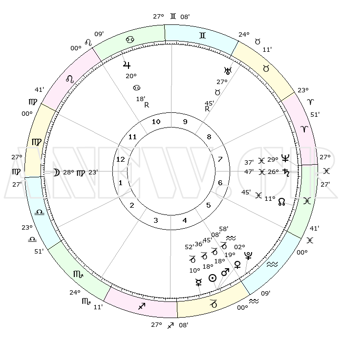 | | ΘΕΣΕΙΣ ΠΛΑΝΗΤΩΝ ΑΣΤΡΟΛΟΓΙΚΟΥ ΧΑΡΤΗ ΤΗΣ ΣΤΙΓΜΗΣ ΑΥΤΗΣ | | | | Πλανήτης | Ζώδιο | Μοίρες | Δεκαήμ. | Σε οίκο | Απόκλιση | | Ακμές των οίκων | | Ηλιος | Αιγόκερως | 17°28' | Δεύτερο | 5 | 22 S 18 | | 1ος | 25°31' | Λέων | | Σελήνη | Παρθένος | 14°10' | Δεύτερο | 1 | 05 N 55 | | 2ος | 18°54' | Παρθένος | | Ερμής | Αιγόκερως | 09°08' | Πρώτο | 5 | 24 S 22 | | 3ος | 17°09' | Ζυγός | | Αφροδίτη | Αιγόκερως | 17°44' | Δεύτερο | 5 | 23 S 00 | | 4ος | 19°59' | Σκορπιός | | Αρης | Αιγόκερως | 17°54' | Δεύτερο | 5 | 23 S 10 | | 5ος | 24°30' | Τοξότης | | Δίας | Καρκίνος | 20°27'R | Τρίτο | 11 | 22 N 08 | | 6ος | 26°50' | Αιγόκερως | | Κρόνος | Ιχθείς | 26°43' | Τρίτο | 8 | 03 S 22 | | 7ος | 25°31' | Υδροχόος | | Ουρανός | Ταύρος | 27°46'R | Τρίτο | 10 | 19 N 28 | | 8ος | 18°54' | Ιχθείς | | Ποσειδώνας | Ιχθείς | 29°36' | Τρίτο | 8 | 01 S 23 | | 9ος | 17°09' | Κριός | | Πλούτωνας | Υδροχόος | 02°56' | Πρώτο | 6 | 23 S 11 | | 10ος | 19°59' | Ταύρος | | Β. Δεσμός | Ιχθείς | 11°49' | Δεύτερο | 7 | 07 S 08 | | 11ος | 24°30' | Δίδυμοι | | Ωροσκόπος | Λέων | 25°31' | Τρίτο | | | 12ος | 26°50' | Καρκίνος | | Μεσουράνημα | Ταύρος | 19°59' | Δεύτερο | | | |