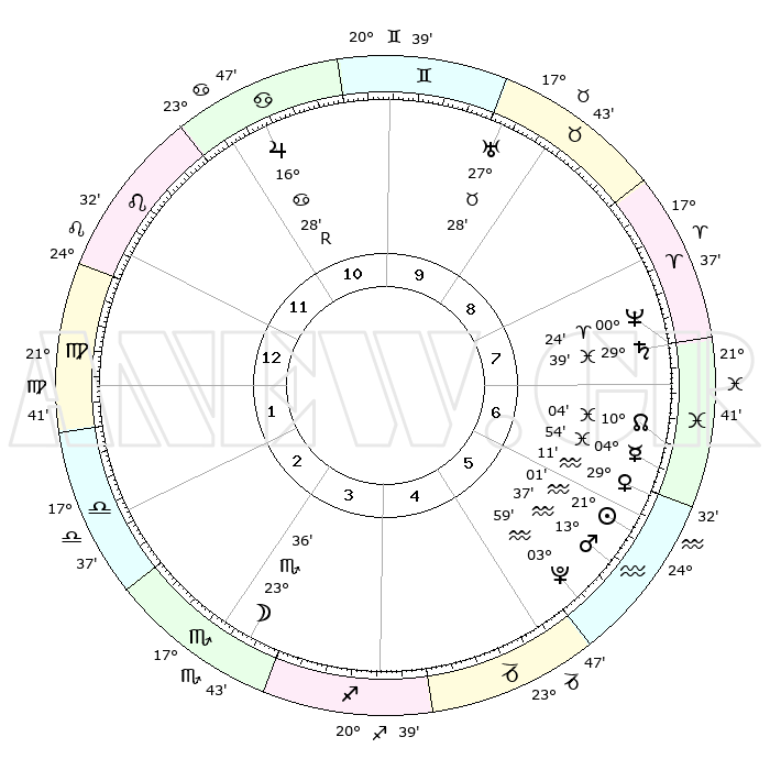 | | ΘΕΣΕΙΣ ΠΛΑΝΗΤΩΝ ΑΣΤΡΟΛΟΓΙΚΟΥ ΧΑΡΤΗ ΤΗΣ ΣΤΙΓΜΗΣ ΑΥΤΗΣ | | | | Πλανήτης | Ζώδιο | Μοίρες | Δεκαήμ. | Σε οίκο | Απόκλιση | | Ακμές των οίκων | | Ηλιος | Υδροχόος | 20°58' | Τρίτο | 6 | 14 S 30 | | 1ος | 07°24' | Παρθένος | | Σελήνη | Σκορπιός | 23°01' | Τρίτο | 3 | 23 S 24 | | 2ος | 02°01' | Ζυγός | | Ερμής | Ιχθείς | 04°49' | Πρώτο | 6 | 10 S 38 | | 3ος | 01°18' | Σκορπιός | | Αφροδίτη | Υδροχόος | 29°07' | Τρίτο | 6 | 13 S 08 | | 4ος | 04°15' | Τοξότης | | Αρης | Υδροχόος | 13°34' | Δεύτερο | 6 | 17 S 46 | | 5ος | 07°59' | Αιγόκερως | | Δίας | Καρκίνος | 16°28'R | Δεύτερο | 11 | 22 N 44 | | 6ος | 09°25' | Υδροχόος | | Κρόνος | Ιχθείς | 29°39' | Τρίτο | 7 | 02 S 07 | | 7ος | 07°24' | Ιχθείς | | Ουρανός | Ταύρος | 27°28' | Τρίτο | 9 | 19 N 25 | | 8ος | 02°01' | Κριός | | Ποσειδώνας | Κριός | 00°24' | Πρώτο | 7 | 01 S 03 | | 9ος | 01°18' | Ταύρος | | Πλούτωνας | Υδροχόος | 03°58' | Πρώτο | 5 | 22 S 58 | | 10ος | 04°15' | Δίδυμοι | | Β. Δεσμός | Ιχθείς | 10°04' | Δεύτερο | 7 | 07 S 48 | | 11ος | 07°59' | Καρκίνος | | Ωροσκόπος | Παρθένος | 07°24' | Πρώτο | | | 12ος | 09°25' | Λέων | | Μεσουράνημα | Δίδυμοι | 04°15' | Πρώτο | | | |