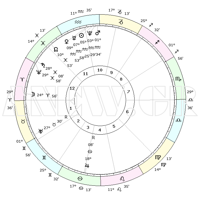 | | ΘΕΣΕΙΣ ΠΛΑΝΗΤΩΝ ΑΣΤΡΟΛΟΓΙΚΟΥ ΧΑΡΤΗ ΤΗΣ ΣΤΙΓΜΗΣ ΑΥΤΗΣ | | | | Πλανήτης | Ζώδιο | Μοίρες | Δεκαήμ. | Σε οίκο | Απόκλιση | | Ακμές των οίκων | | Ηλιος | Υδροχόος | 05°20' | Πρώτο | 11 | 18 S 56 | | 1ος | 14°20' | Ιχθείς | | Σελήνη | Κριός | 23°51' | Τρίτο | 1 | 12 N 39 | | 2ος | 27°55' | Κριός | | Ερμής | Υδροχόος | 07°50' | Πρώτο | 11 | 20 S 19 | | 3ος | 27°55' | Ταύρος | | Αφροδίτη | Υδροχόος | 09°47' | Πρώτο | 12 | 18 S 59 | | 4ος | 21°07' | Δίδυμοι | | Αρης | Υδροχόος | 01°31' | Πρώτο | 11 | 20 S 49 | | 5ος | 12°55' | Καρκίνος | | Δίας | Καρκίνος | 18°09'R | Δεύτερο | 5 | 22 N 30 | | 6ος | 08°08' | Λέων | | Κρόνος | Ιχθείς | 28°07' | Τρίτο | 1 | 02 S 45 | | 7ος | 14°20' | Παρθένος | | Ουρανός | Ταύρος | 27°30'R | Τρίτο | 2 | 19 N 25 | | 8ος | 27°55' | Ζυγός | | Ποσειδώνας | Ιχθείς | 29°58' | Τρίτο | 1 | 01 S 13 | | 9ος | 27°55' | Σκορπιός | | Πλούτωνας | Υδροχόος | 03°29' | Πρώτο | 11 | 23 S 04 | | 10ος | 21°07' | Τοξότης | | Β. Δεσμός | Ιχθείς | 10°53' | Δεύτερο | 12 | 07 S 29 | | 11ος | 12°55' | Αιγόκερως | | Ωροσκόπος | Ιχθείς | 14°20' | Δεύτερο | | | 12ος | 08°08' | Υδροχόος | | Μεσουράνημα | Τοξότης | 21°07' | Τρίτο | | | |