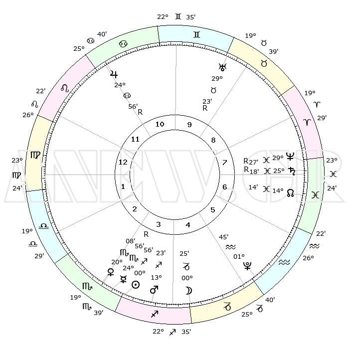| | ΘΕΣΕΙΣ ΠΛΑΝΗΤΩΝ ΑΣΤΡΟΛΟΓΙΚΟΥ ΧΑΡΤΗ ΤΗΣ ΣΤΙΓΜΗΣ ΑΥΤΗΣ | | | | Πλανήτης | Ζώδιο | Μοίρες | Δεκαήμ. | Σε οίκο | Απόκλιση | | Ακμές των οίκων | | Ηλιος | Τοξότης | 00°52' | Πρώτο | 3 | 20 S 20 | | 1ος | 04°51' | Παρθένος | | Σελήνη | Τοξότης | 29°40' | Τρίτο | 4 | 28 S 16 | | 2ος | 29°12' | Παρθένος | | Ερμής | Σκορπιός | 25°00'R | Τρίτο | 3 | 17 S 42 | | 3ος | 28°17' | Ζυγός | | Αφροδίτη | Σκορπιός | 20°04' | Τρίτο | 3 | 16 S 49 | | 4ος | 01°14' | Τοξότης | | Αρης | Τοξότης | 13°21' | Δεύτερο | 4 | 22 S 59 | | 5ος | 05°07' | Αιγόκερως | | Δίας | Καρκίνος | 24°56'R | Τρίτο | 11 | 21 N 16 | | 6ος | 06°43' | Υδροχόος | | Κρόνος | Ιχθείς | 25°18'R | Τρίτο | 7 | 04 S 04 | | 7ος | 04°51' | Ιχθείς | | Ουρανός | Ταύρος | 29°23'R | Τρίτο | 9 | 19 N 49 | | 8ος | 29°12' | Ιχθείς | | Ποσειδώνας | Ιχθείς | 29°27'R | Τρίτο | 8 | 01 S 28 | | 9ος | 28°17' | Κριός | | Πλούτωνας | Υδροχόος | 01°45' | Πρώτο | 5 | 23 S 26 | | 10ος | 01°14' | Δίδυμοι | | Β. Δεσμός | Ιχθείς | 14°14' | Δεύτερο | 7 | 06 S 12 | | 11ος | 05°07' | Καρκίνος | | Ωροσκόπος | Παρθένος | 04°51' | Πρώτο | | | 12ος | 06°43' | Λέων | | Μεσουράνημα | Δίδυμοι | 01°14' | Πρώτο | | | |