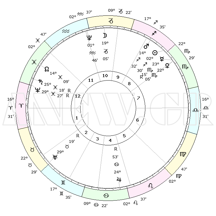 | | ΘΕΣΕΙΣ ΠΛΑΝΗΤΩΝ ΑΣΤΡΟΛΟΓΙΚΟΥ ΧΑΡΤΗ ΤΗΣ ΣΤΙΓΜΗΣ ΑΥΤΗΣ | | | | Πλανήτης | Ζώδιο | Μοίρες | Δεκαήμ. | Σε οίκο | Απόκλιση | | Ακμές των οίκων | | Ηλιος | Τοξότης | 02°26' | Πρώτο | 9 | 20 S 39 | | 1ος | 13°37' | Ιχθείς | | Σελήνη | Αιγόκερως | 18°24' | Δεύτερο | 11 | 26 S 18 | | 2ος | 27°20' | Κριός | | Ερμής | Σκορπιός | 23°18'R | Τρίτο | 8 | 16 S 53 | | 3ος | 27°28' | Ταύρος | | Αφροδίτη | Σκορπιός | 22°01' | Τρίτο | 8 | 17 S 22 | | 4ος | 20°42' | Δίδυμοι | | Αρης | Τοξότης | 14°29' | Δεύτερο | 9 | 23 S 08 | | 5ος | 12°30' | Καρκίνος | | Δίας | Καρκίνος | 24°53'R | Τρίτο | 5 | 21 N 17 | | 6ος | 07°37' | Λέων | | Κρόνος | Ιχθείς | 25°18'R | Τρίτο | 1 | 04 S 04 | | 7ος | 13°37' | Παρθένος | | Ουρανός | Ταύρος | 29°19'R | Τρίτο | 3 | 19 N 48 | | 8ος | 27°20' | Ζυγός | | Ποσειδώνας | Ιχθείς | 29°27'R | Τρίτο | 1 | 01 S 28 | | 9ος | 27°28' | Σκορπιός | | Πλούτωνας | Υδροχόος | 01°46' | Πρώτο | 11 | 23 S 26 | | 10ος | 20°42' | Τοξότης | | Β. Δεσμός | Ιχθείς | 14°09' | Δεύτερο | 1 | 06 S 14 | | 11ος | 12°30' | Αιγόκερως | | Ωροσκόπος | Ιχθείς | 13°37' | Δεύτερο | | | 12ος | 07°37' | Υδροχόος | | Μεσουράνημα | Τοξότης | 20°42' | Τρίτο | | | |