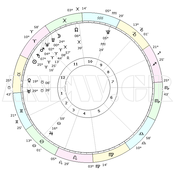 | | ΘΕΣΕΙΣ ΠΛΑΝΗΤΩΝ ΑΣΤΡΟΛΟΓΙΚΟΥ ΧΑΡΤΗ ΤΗΣ ΣΤΙΓΜΗΣ ΑΥΤΗΣ | | | | Πλανήτης | Ζώδιο | Μοίρες | Δεκαήμ. | Σε οίκο | Απόκλιση | | Ακμές των οίκων | | Ηλιος | Κριός | 25°13' | Τρίτο | 12 | 09 N 45 | | 1ος | 26°47' | Κριός | | Σελήνη | Ιχθείς | 24°08' | Τρίτο | 12 | 01 S 01 | | 2ος | 29°54' | Ταύρος | | Ερμής | Κριός | 00°03'R | Πρώτο | 12 | 02 S 22 | | 3ος | 23°48' | Δίδυμοι | | Αφροδίτη | Ταύρος | 19°02' | Δεύτερο | 1 | 17 N 39 | | 4ος | 15°29' | Καρκίνος | | Αρης | Κριός | 04°10' | Πρώτο | 12 | 00 N 45 | | 5ος | 09°34' | Λέων | | Δίας | Καρκίνος | 16°59' | Δεύτερο | 4 | 22 N 44 | | 6ος | 11°39' | Παρθένος | | Κρόνος | Κριός | 07°24' | Πρώτο | 12 | 00 N 58 | | 7ος | 26°47' | Ζυγός | | Ουρανός | Ταύρος | 29°26' | Τρίτο | 1 | 19 N 52 | | 8ος | 29°54' | Σκορπιός | | Ποσειδώνας | Κριός | 02°44' | Πρώτο | 12 | 00 S 07 | | 9ος | 23°48' | Τοξότης | | Πλούτωνας | Υδροχόος | 05°24' | Πρώτο | 10 | 22 S 47 | | 10ος | 15°29' | Αιγόκερως | | Β. Δεσμός | Ιχθείς | 06°39' | Πρώτο | 11 | 09 S 04 | | 11ος | 09°34' | Υδροχόος | | Ωροσκόπος | Κριός | 26°47' | Τρίτο | | | 12ος | 11°39' | Ιχθείς | | Μεσουράνημα | Αιγόκερως | 15°29' | Δεύτερο | | | |