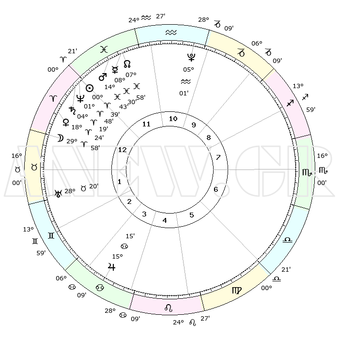 | | ΘΕΣΕΙΣ ΠΛΑΝΗΤΩΝ ΑΣΤΡΟΛΟΓΙΚΟΥ ΧΑΡΤΗ ΤΗΣ ΣΤΙΓΜΗΣ ΑΥΤΗΣ | | | | Πλανήτης | Ζώδιο | Μοίρες | Δεκαήμ. | Σε οίκο | Απόκλιση | | Ακμές των οίκων | | Ηλιος | Κριός | 00°36' | Πρώτο | 12 | 00 N 14 | | 1ος | 10°30' | Κριός | | Σελήνη | Κριός | 29°00' | Τρίτο | 1 | 14 N 53 | | 2ος | 18°06' | Ταύρος | | Ερμής | Ιχθείς | 08°30' | Πρώτο | 12 | 07 S 33 | | 3ος | 13°59' | Δίδυμοι | | Αφροδίτη | Κριός | 18°20' | Δεύτερο | 1 | 06 N 24 | | 4ος | 05°55' | Καρκίνος | | Αρης | Ιχθείς | 14°40' | Δεύτερο | 12 | 07 S 02 | | 5ος | 28°46' | Καρκίνος | | Δίας | Καρκίνος | 15°15' | Δεύτερο | 4 | 22 N 55 | | 6ος | 27°52' | Λέων | | Κρόνος | Κριός | 04°19' | Πρώτο | 12 | 00 S 14 | | 7ος | 10°30' | Ζυγός | | Ουρανός | Ταύρος | 28°20' | Τρίτο | 2 | 19 N 37 | | 8ος | 18°06' | Σκορπιός | | Ποσειδώνας | Κριός | 01°48' | Πρώτο | 12 | 00 S 29 | | 9ος | 13°59' | Τοξότης | | Πλούτωνας | Υδροχόος | 05°01' | Πρώτο | 11 | 22 S 48 | | 10ος | 05°55' | Αιγόκερως | | Β. Δεσμός | Ιχθείς | 07°59' | Πρώτο | 12 | 08 S 35 | | 11ος | 28°46' | Αιγόκερως | | Ωροσκόπος | Κριός | 10°30' | Δεύτερο | | | 12ος | 27°52' | Υδροχόος | | Μεσουράνημα | Αιγόκερως | 05°55' | Πρώτο | | | |