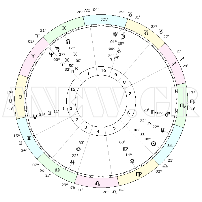 | ΘΕΣΕΙΣ ΠΛΑΝΗΤΩΝ ΑΣΤΡΟΛΟΓΙΚΟΥ ΧΑΡΤΗ ΤΗΣ ΣΤΙΓΜΗΣ ΑΥΤΗΣ | | Πλανήτης | Ζώδιο | Μοίρες | Δεκαήμ. | Σε οίκο | Απόκλιση | | Ακμές των οίκων | Ηλιος | Ζυγός | 08°43' | Πρώτο | 7 | 03 S 27 | | 1ος | 00°09' | Κριός | Σελήνη | Αιγόκερως | 27°47' | Τρίτο | 11 | 24 S 34 | | 2ος | 10°24' | Ταύρος | Ερμής | Ζυγός | 22°14' | Τρίτο | 7 | 08 S 49 | | 3ος | 07°47' | Δίδυμοι | Αφροδίτη | Παρθένος | 14°53' | Δεύτερο | 6 | 07 N 09 | | 4ος | 00°05' | Καρκίνος | Αρης | Σκορπιός | 06°19' | Πρώτο | 7 | 13 S 42 | | 5ος | 22°24' | Καρκίνος | Δίας | Καρκίνος | 22°33' | Τρίτο | 5 | 21 N 34 | | 6ος | 19°49' | Λέων | Κρόνος | Ιχθείς | 27°50'R | Τρίτο | 12 | 03 S 10 | | 7ος | 00°09' | Ζυγός | Ουρανός | Δίδυμοι | 01°12'R | Πρώτο | 2 | 20 N 11 | | 8ος | 10°24' | Σκορπιός | Ποσειδώνας | Κριός | 00°32'R | Πρώτο | 1 | 01 S 03 | | 9ος | 07°47' | Τοξότης | Πλούτωνας | Υδροχόος | 01°24'R | Πρώτο | 11 | 23 S 32 | | 10ος | 00°05' | Αιγόκερως | Β. Δεσμός | Ιχθείς | 17°00' | Δεύτερο | 12 | 05 S 08 | | 11ος | 22°24' | Αιγόκερως | Ωροσκόπος | Κριός | 00°09' | Πρώτο | | | 12ος | 19°49' | Υδροχόος | Μεσουράνημα | Αιγόκερως | 00°05' | Πρώτο | | | |
